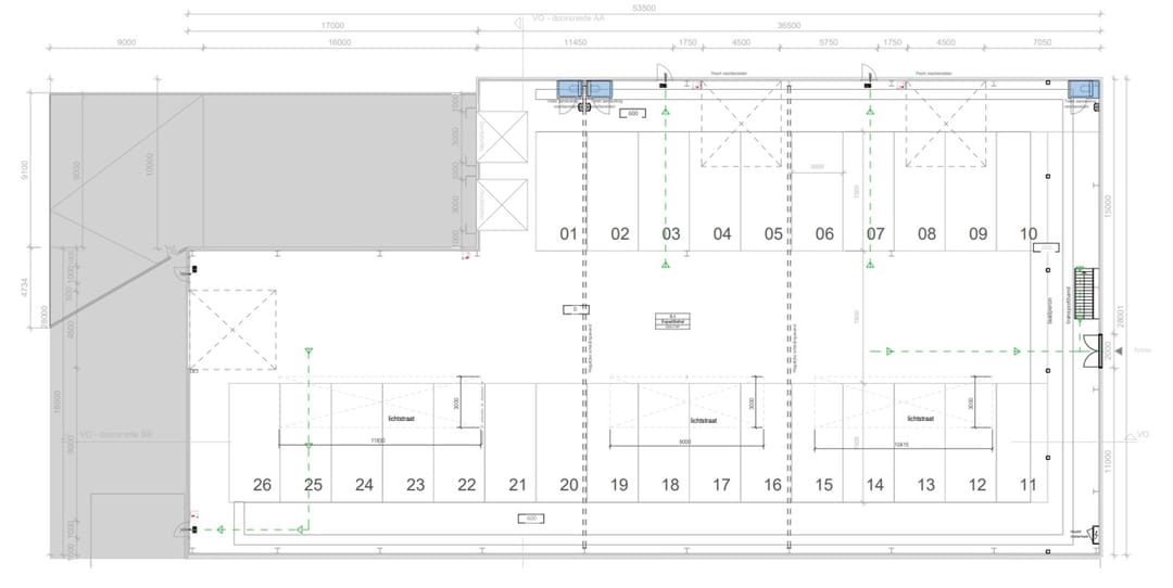 - Mechanische ventilatie, lichtstraten, loading docks, overheaddeuren, krachtstroom, betonvloer, toilet, inbouwarmaturen en te openen ramen