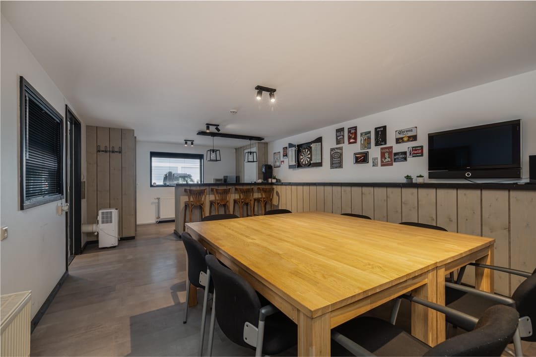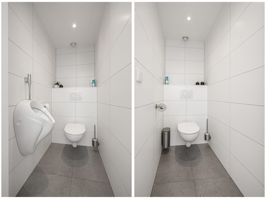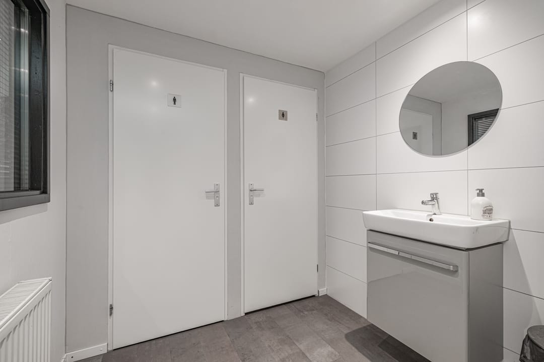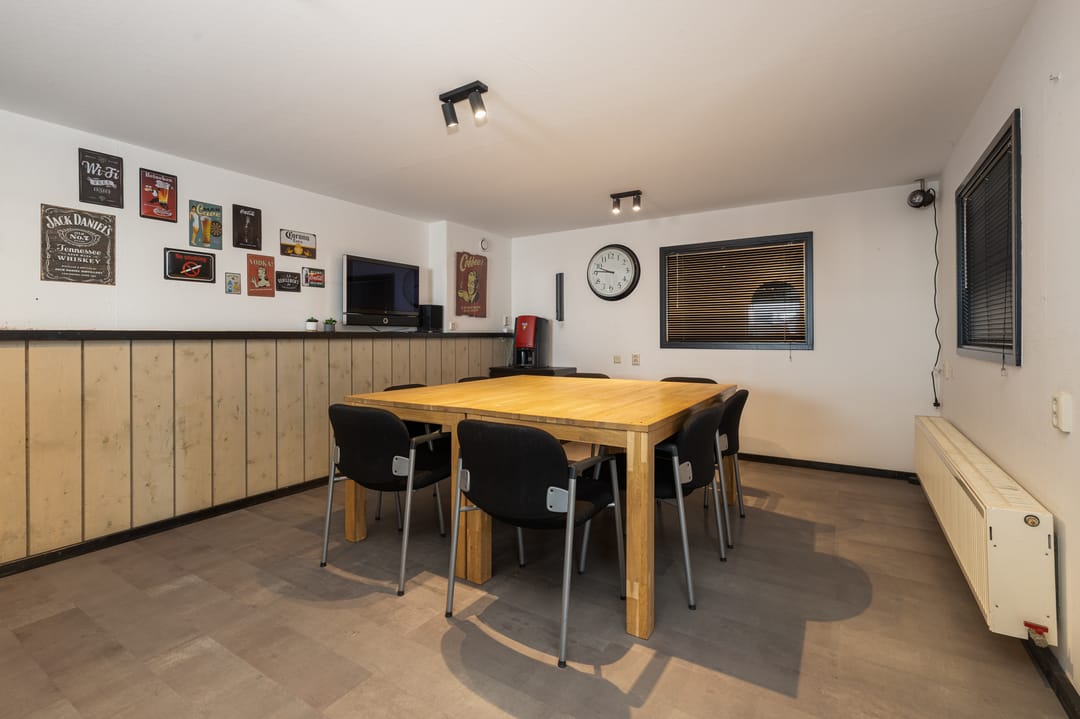 Entree in de hal met toegang tot alle vertrekken. Kantoor/kantine van ca. 30m2 gelegen aan de voorkant van het pand. Uitgevoerd met een keuken met bar, radiatoren en de kast met de cv-ketel. Vanuit de overloop toegang tot de toiletten. Beide toiletten zijn in zijn geheel betegeld in het wit en uitgevoerd met een hangend toilet waarvan één toilet tevens is voorzien van een urinoir. Losse wastafel met meubel en spiegel.