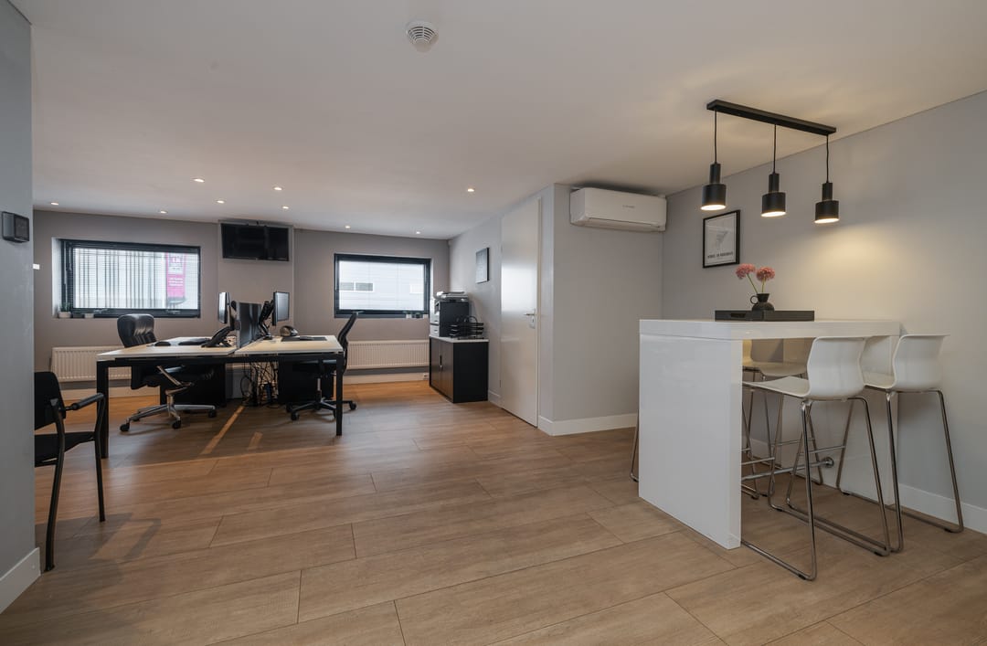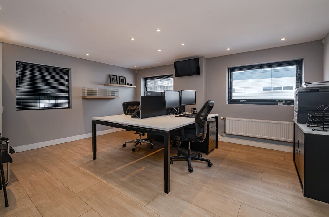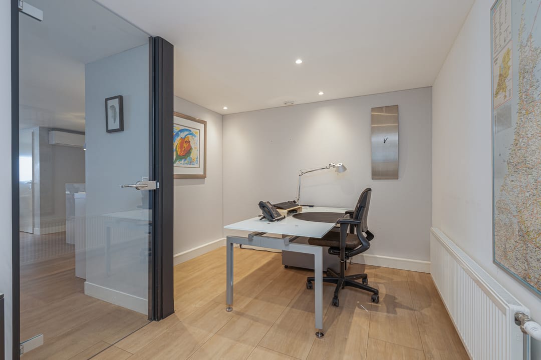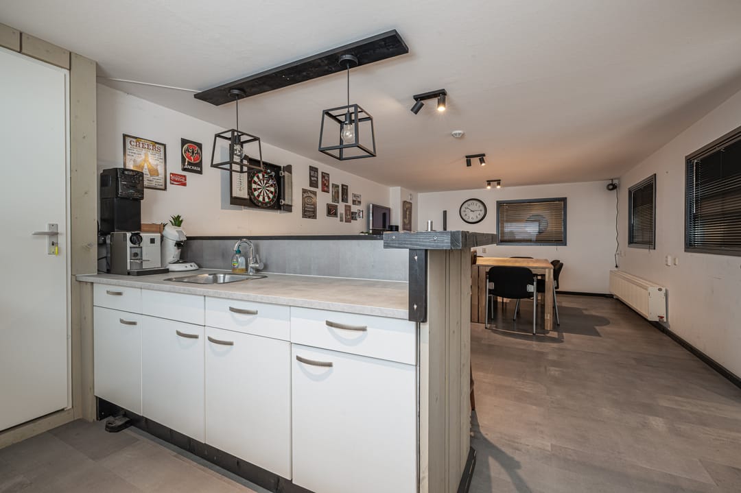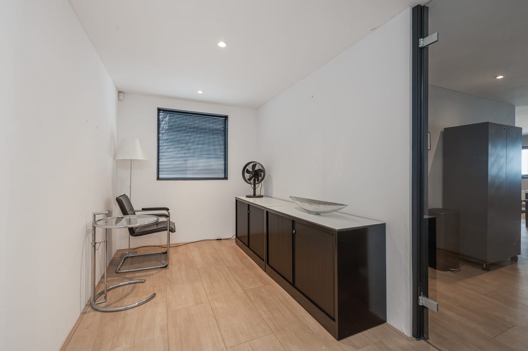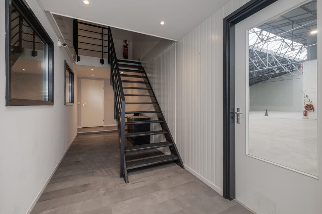 Overloop met toegang tot twee kantoren van ca. 14 en 32m2. Het kantoor van 32m2 is gelegen aan de voorkant en is voorzien va een laminaatvloer, inbouwspots, radiatoren, airco en een keuken. Tevens een bergruimte van ca. 3,5m2. Het kantoor van ca. 14m2 is bereikbaar middels een glazen deur en is eveneens voorzien van een nette laminaatvloer en een raam met uitzicht op de bedrijfshal.