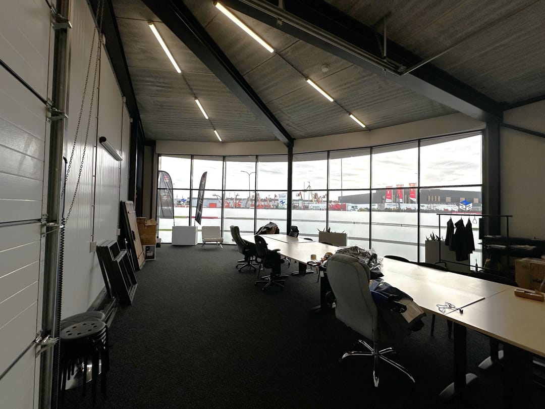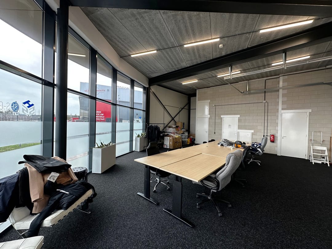- Overheaddeuren, betonvloer, toilet, pantry, airconditioning, inbouwarmaturen en te openen ramen