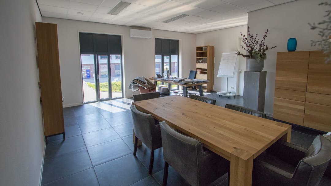 - Overheaddeuren, krachtstroom, betonvloer, toilet, pantry, airconditioning, inbouwarmaturen en te openen ramen