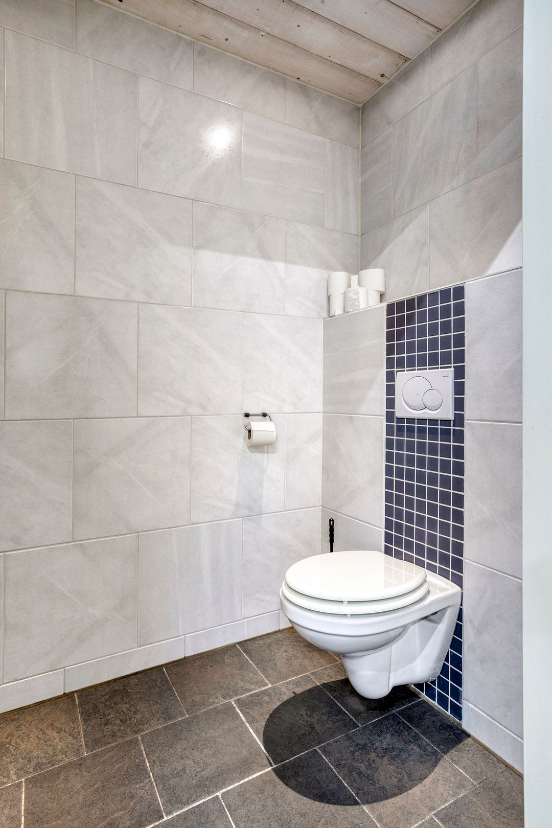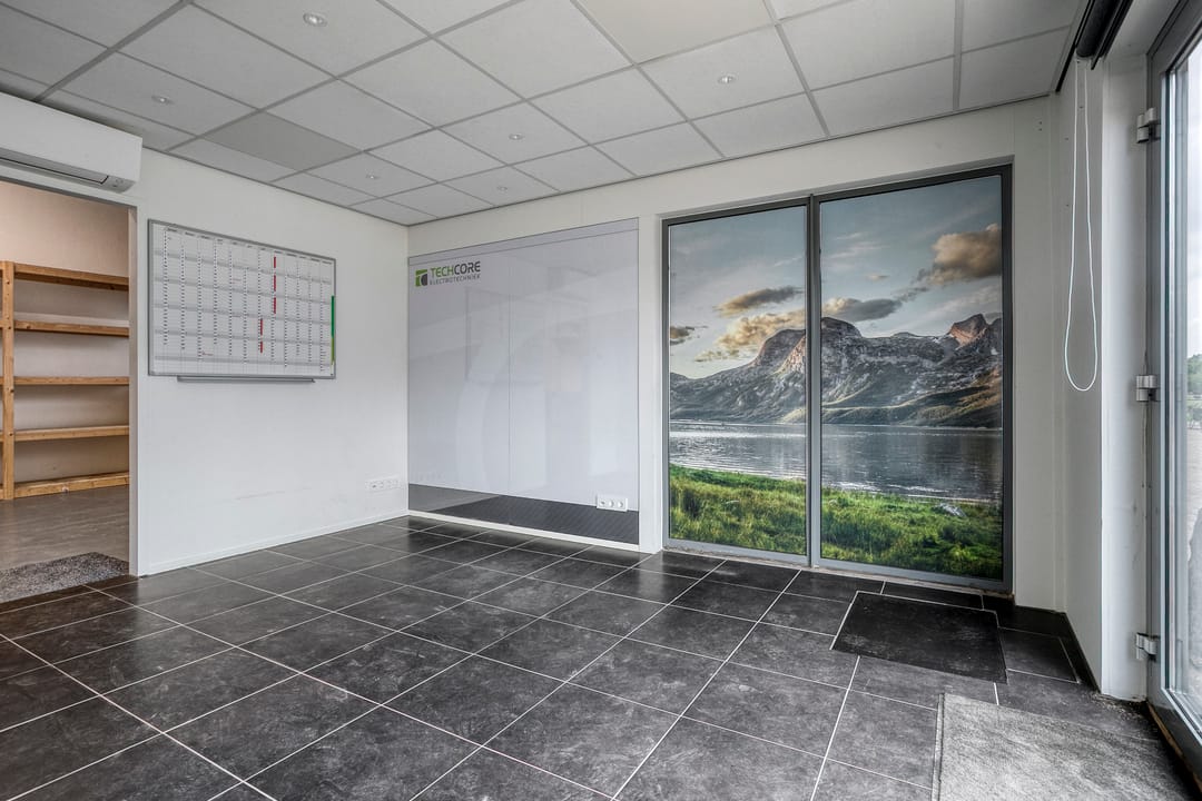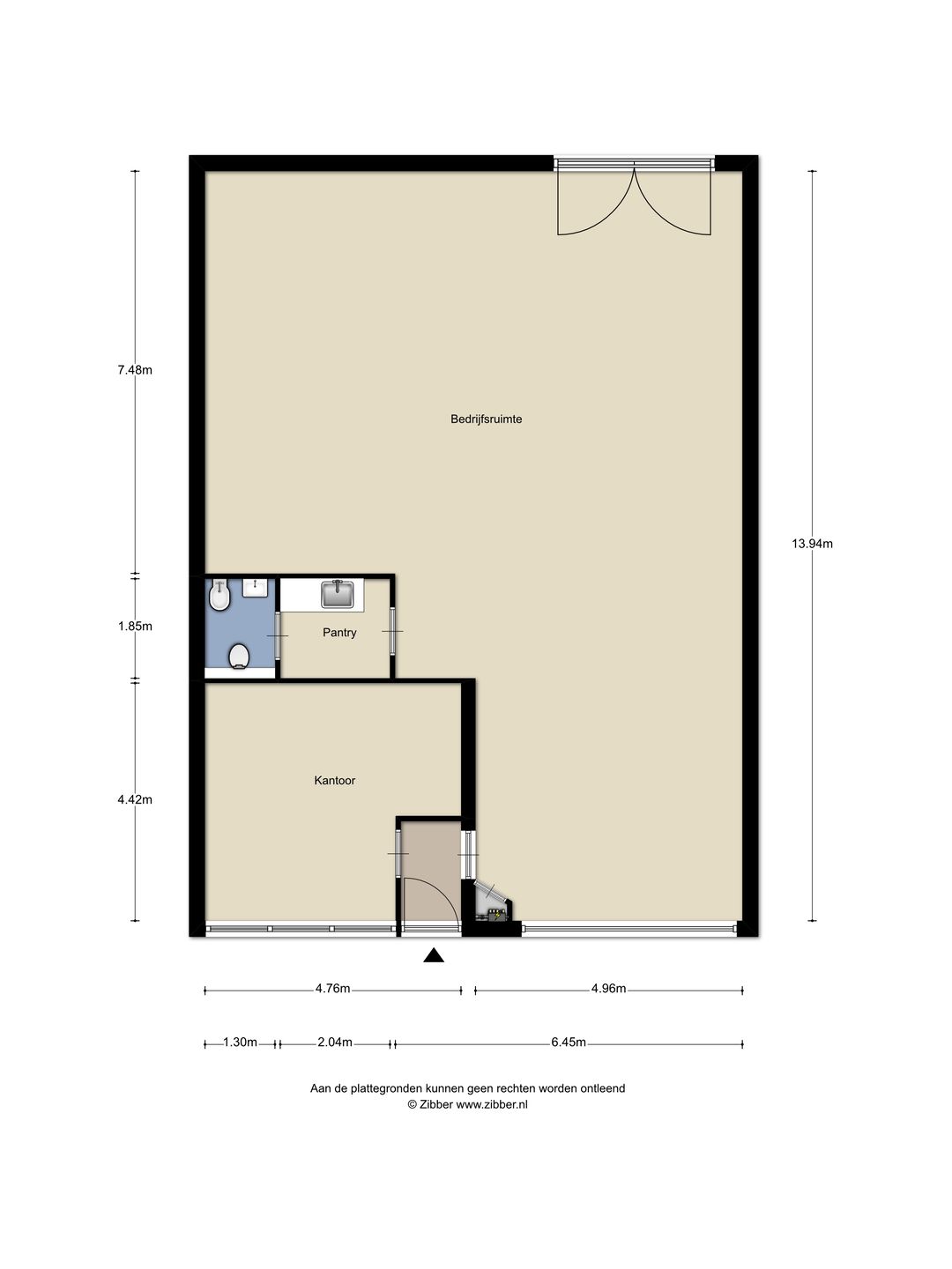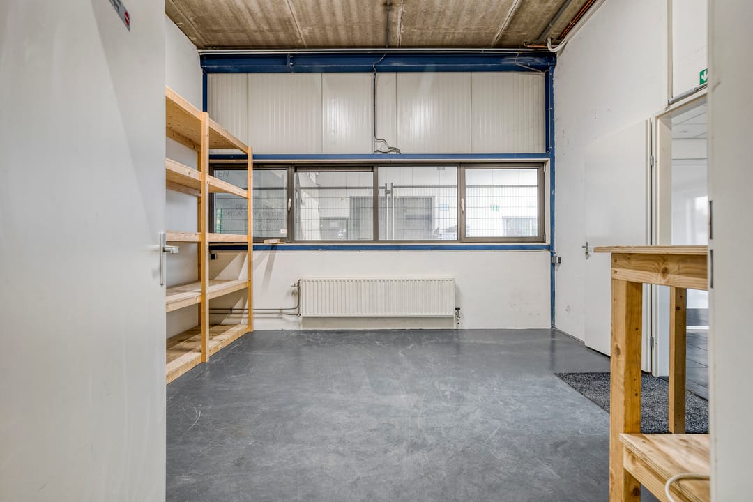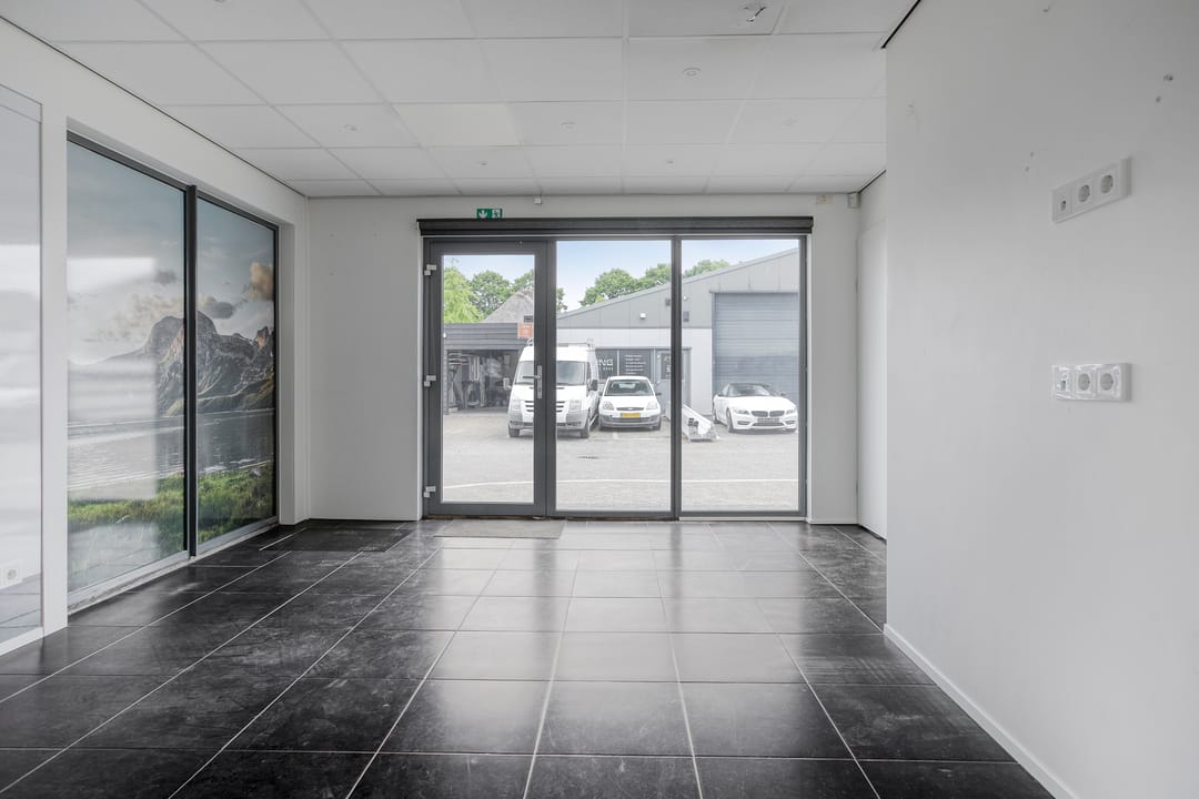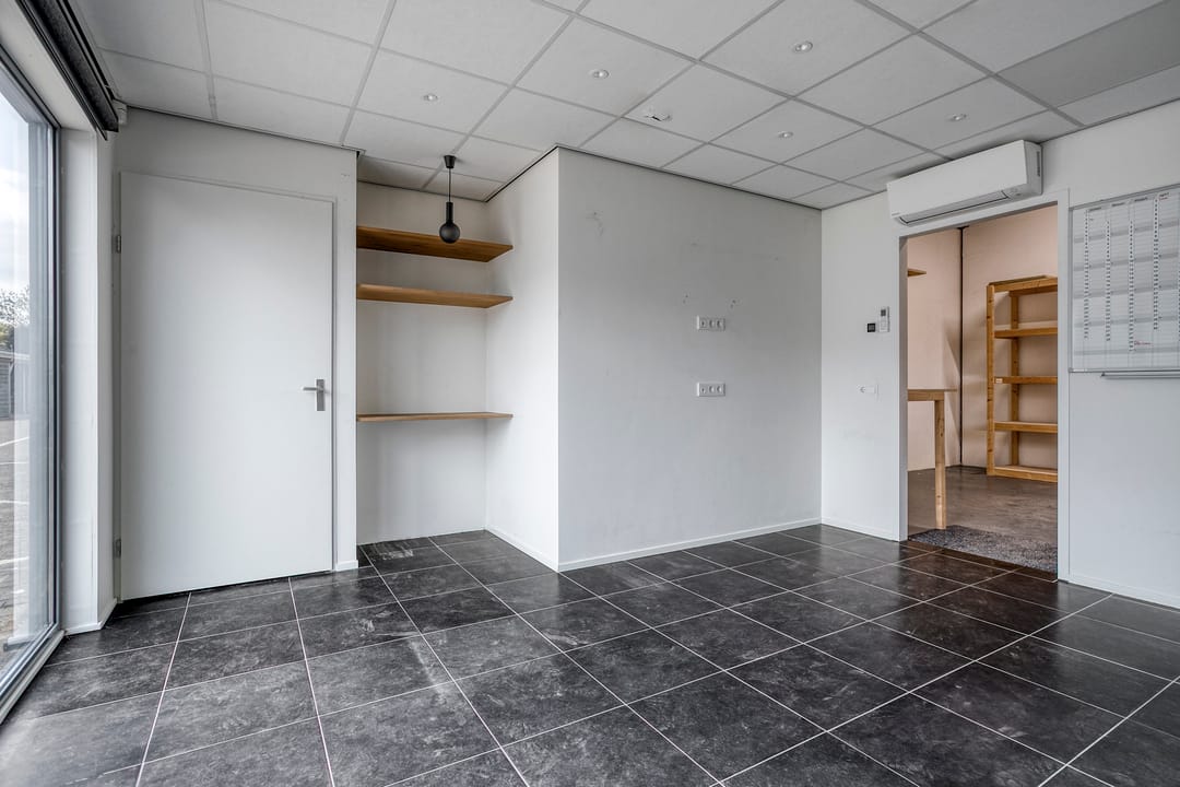 Via de loopdeur aan de voorzijde bereik je de entree en de kantoorruimte met een oppervlakte van ca. 22 m² met daarachter een extra ruimte van ca. 22 m². De toiletgroep is voorzien van een vrijhangend toilet, urinoir en wastafel.