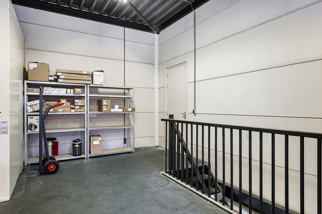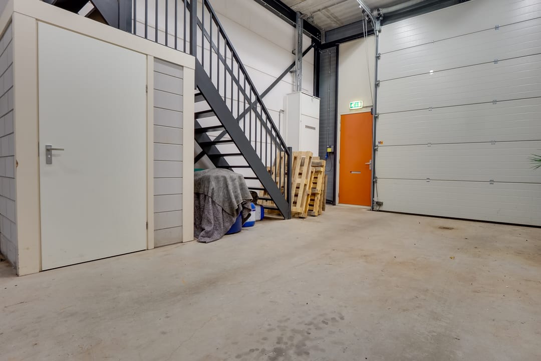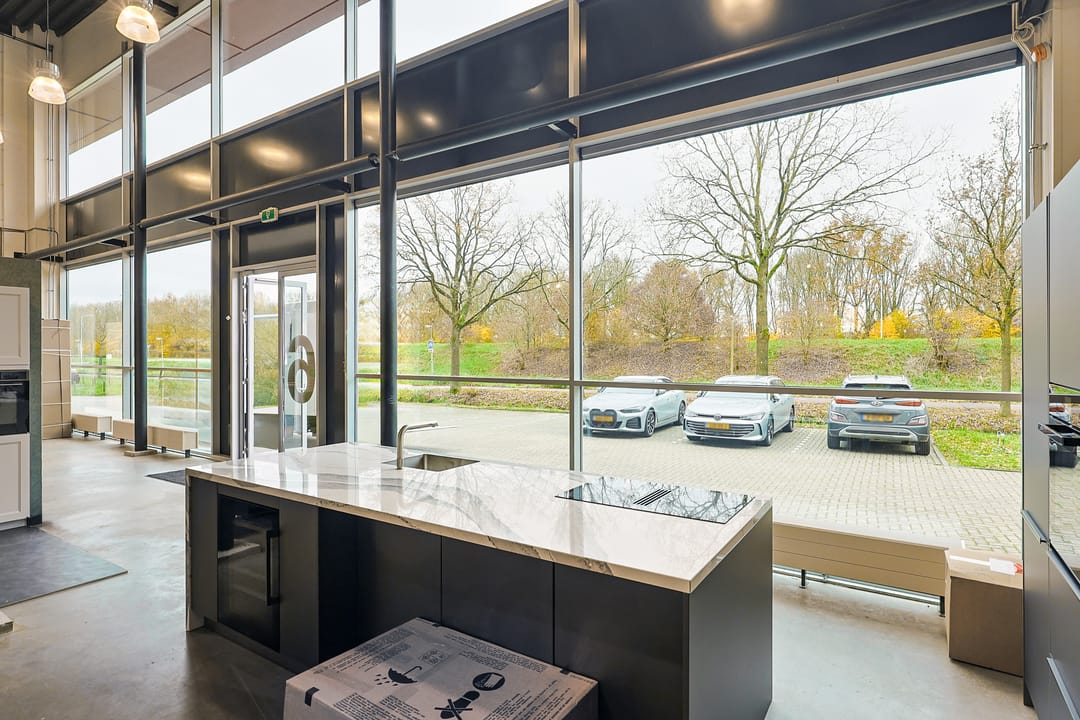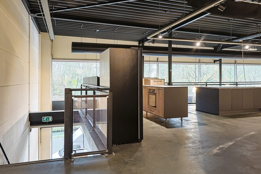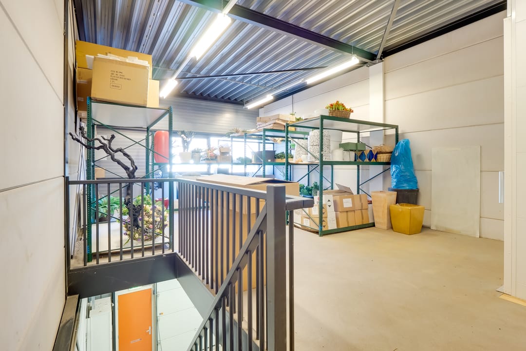 De voorzijde bestaat uit een ruime showroom-/bedrijfsruimte met een zwevende tussenvloer met showroom en kantoor.