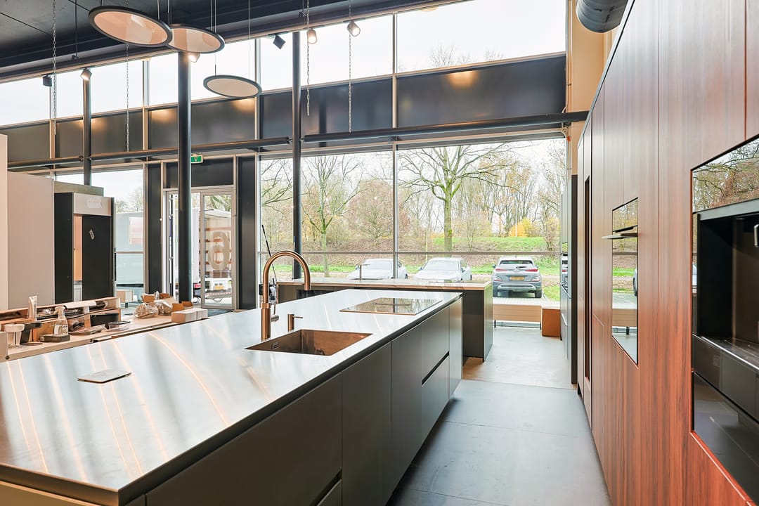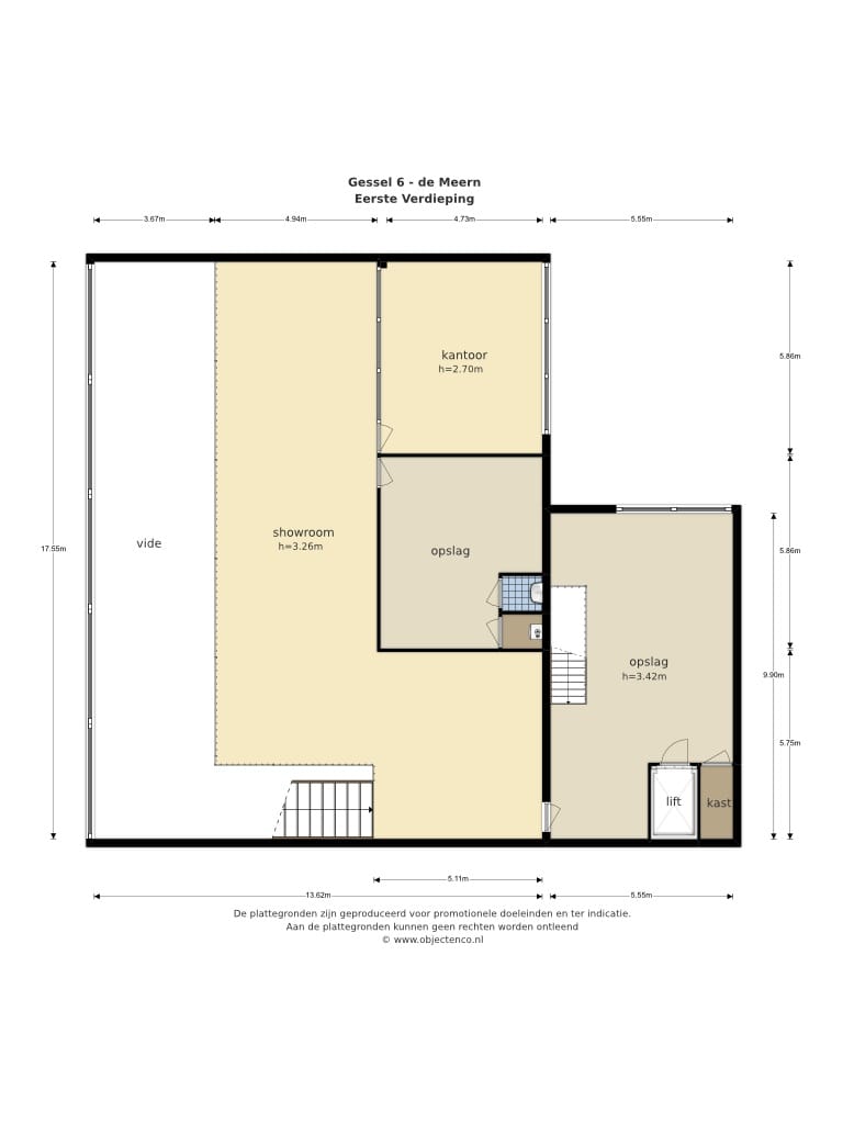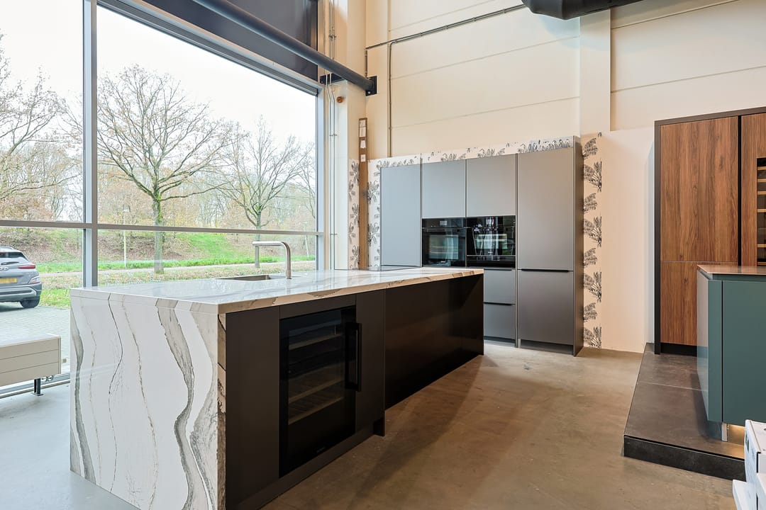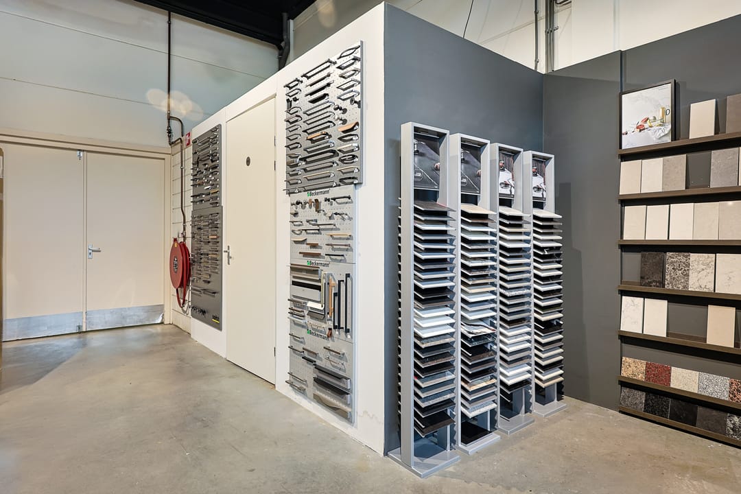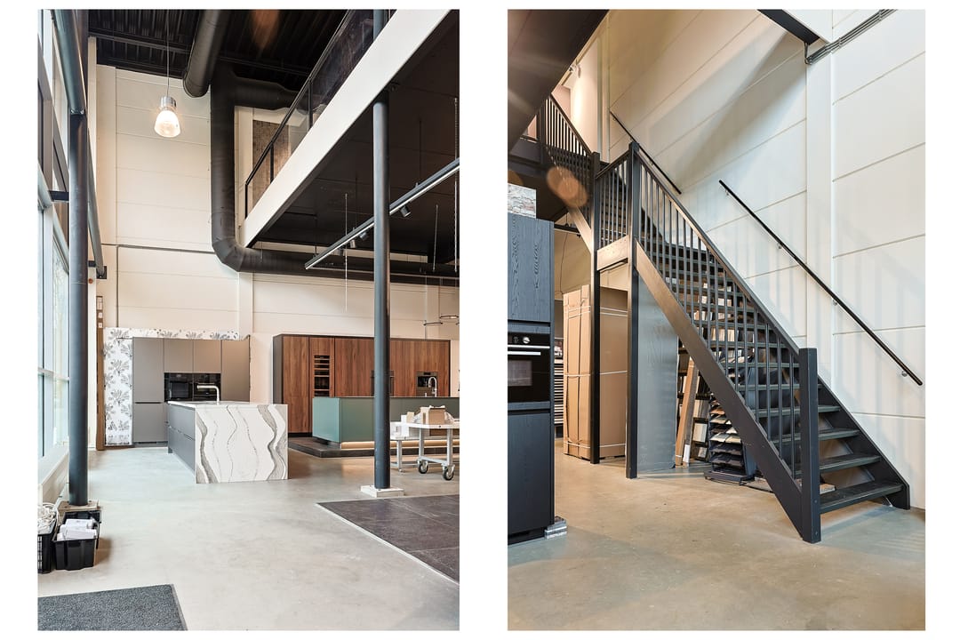 De voorzijde bestaat uit een ruime showroom-/bedrijfsruimte met een zwevende tussenvloer met showroom en kantoor.