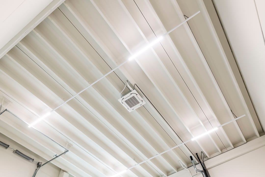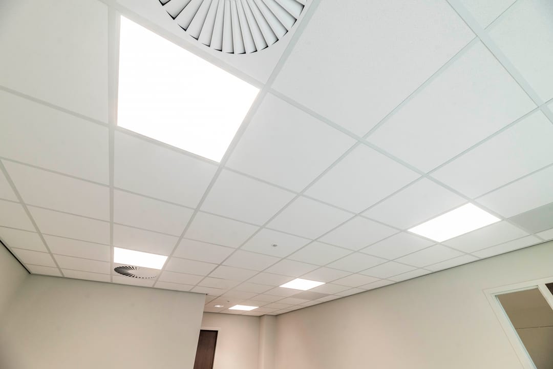 • airco-installatie met wervelroosters in plafond die koelen en verwarmen;