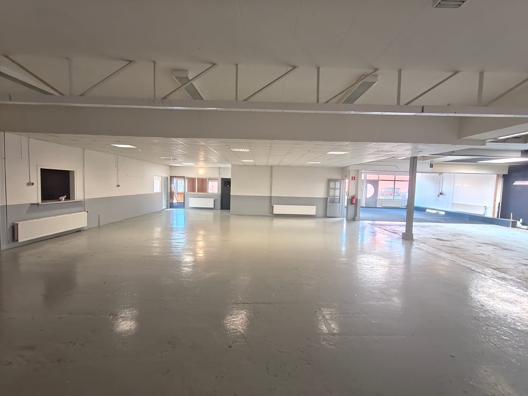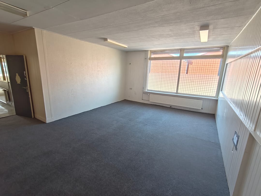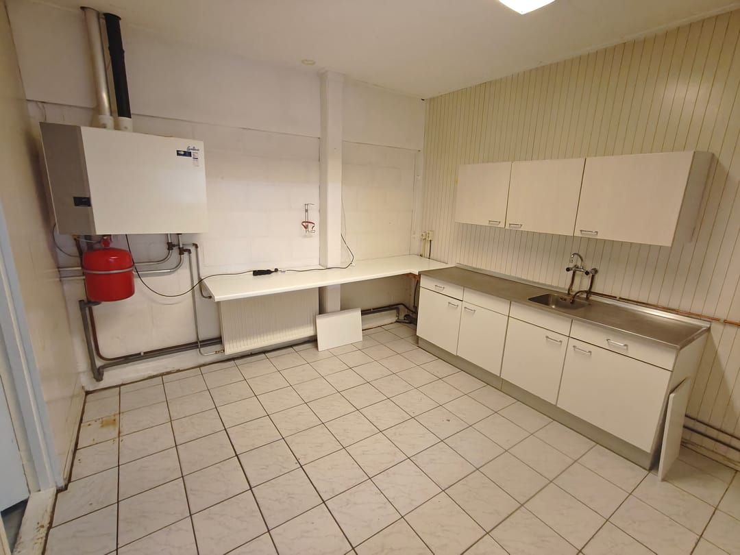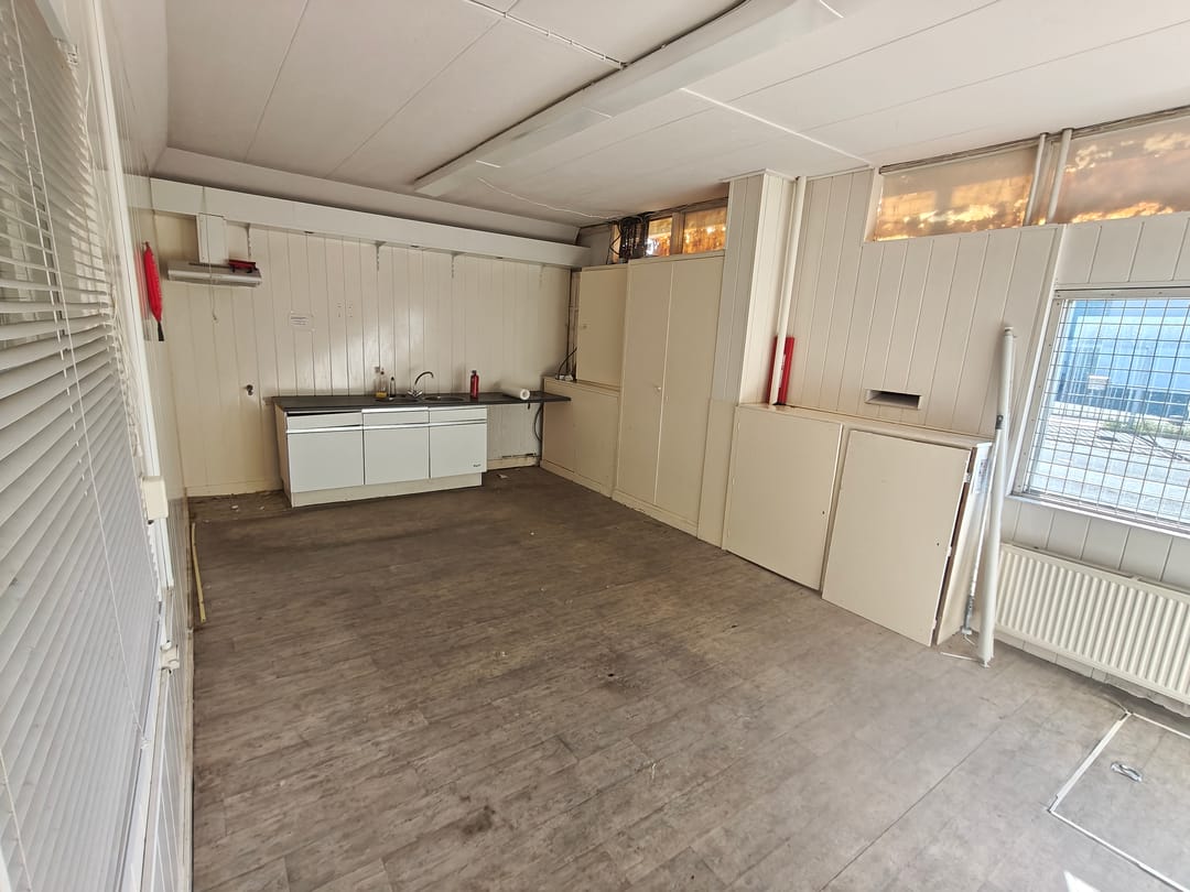 Betonvloer (gedeeltelijk), laminaatvloer (gedeeltelijk), vloerbedekking (gedeeltelijk), twee kantines met pantry's, twee toiletten en een overheaddeur.