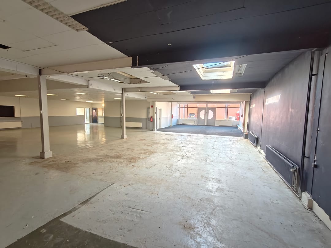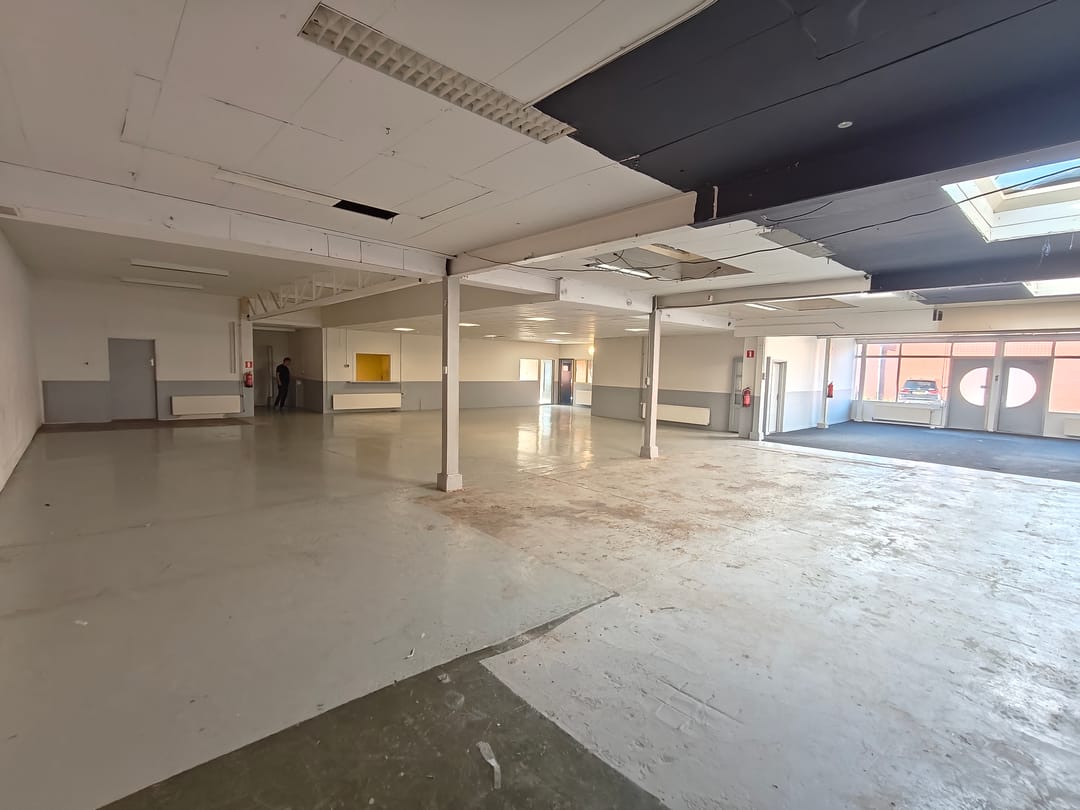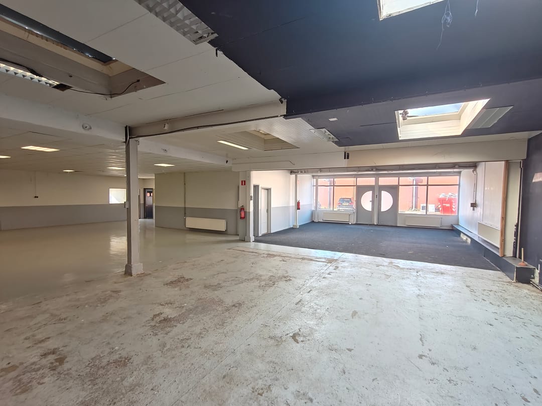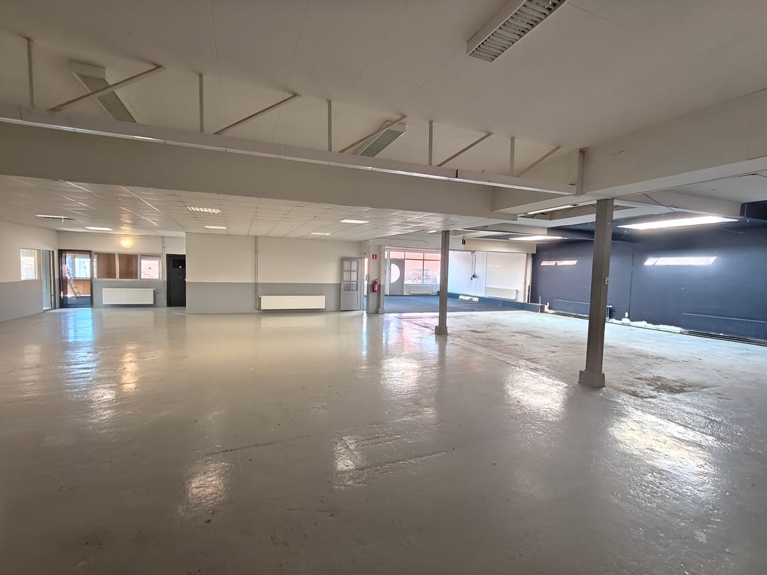 Betonvloer (gedeeltelijk), laminaatvloer (gedeeltelijk), vloerbedekking (gedeeltelijk), twee kantines met pantry's, twee toiletten en een overheaddeur.