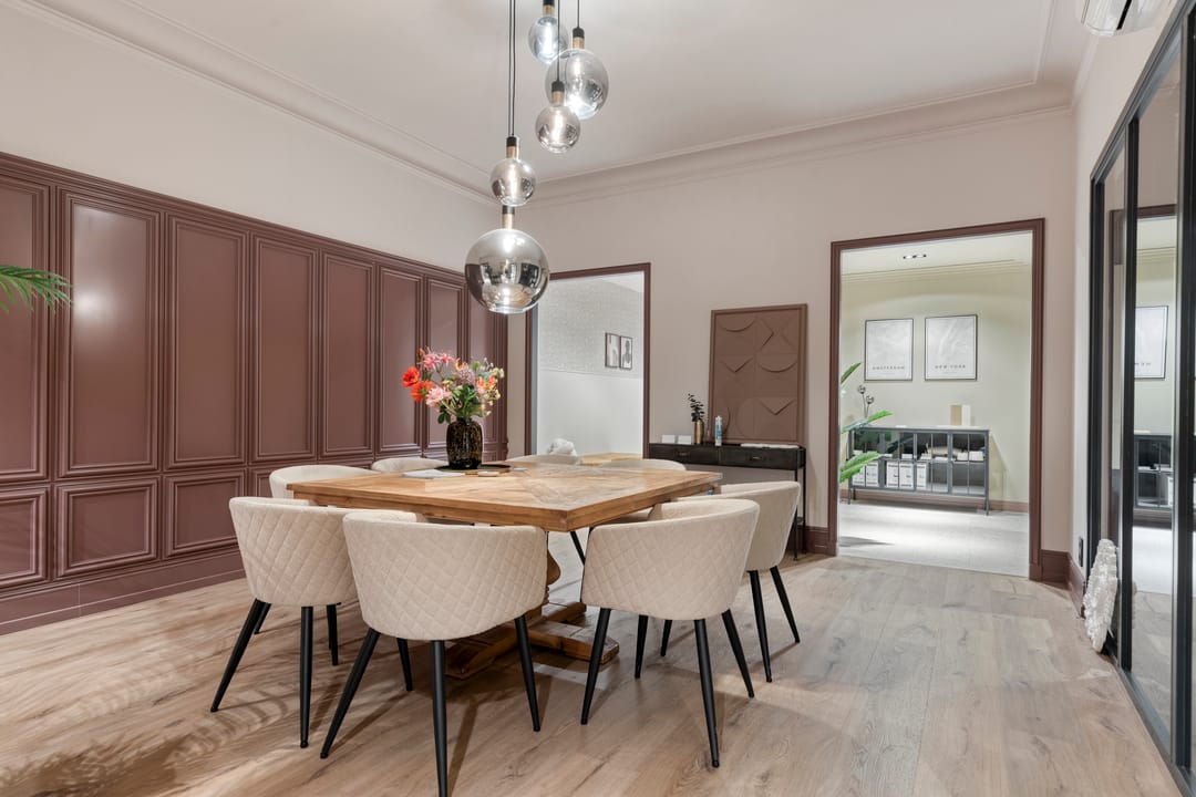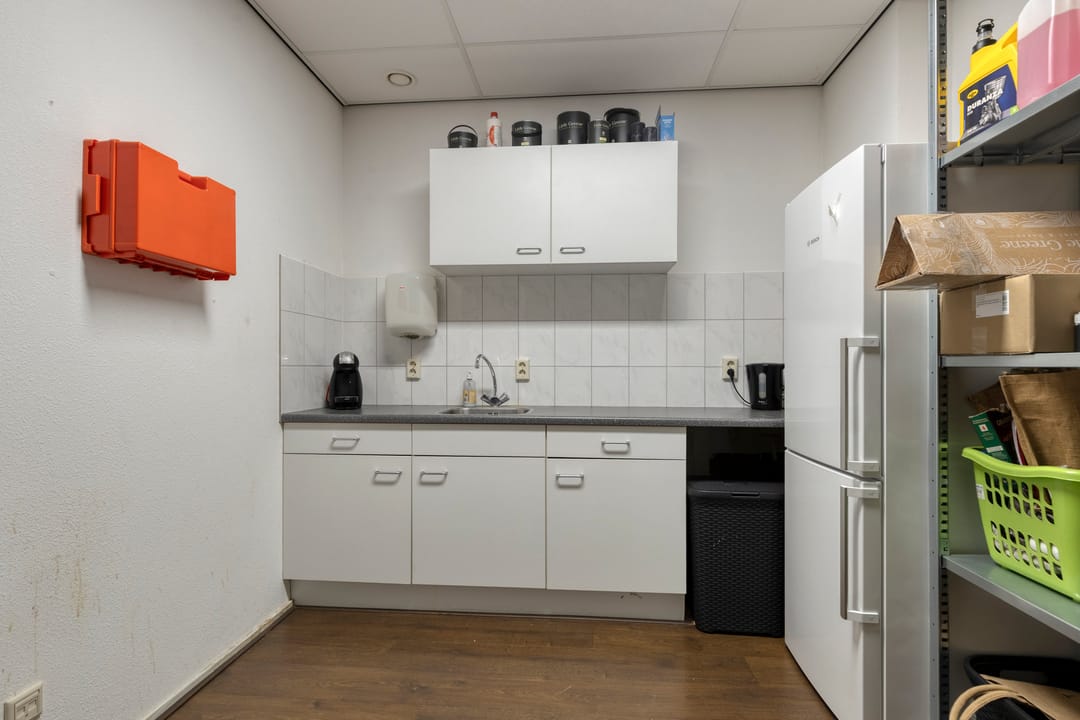 Betonnen vloer afgewerkt met pvc, spuitwerk wanden, systeemplafond met inlegarmatuur, mechanische ventilatie en keukenblok met bovenkasten.