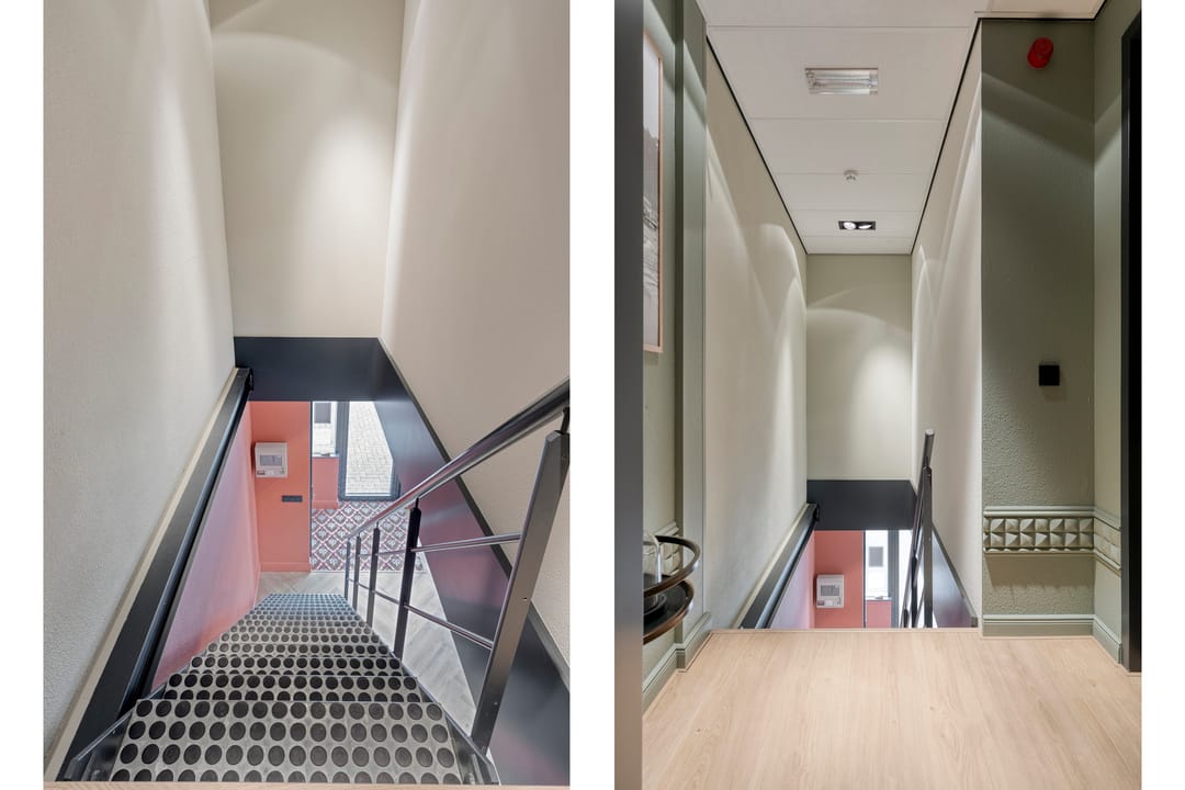 Monolithische afgewerkte betonnen vloer, afgewerkte wanden, systeemplafond met inbouwarmaturen, stalen trap naar verdieping en toegang tot gang/portaal.