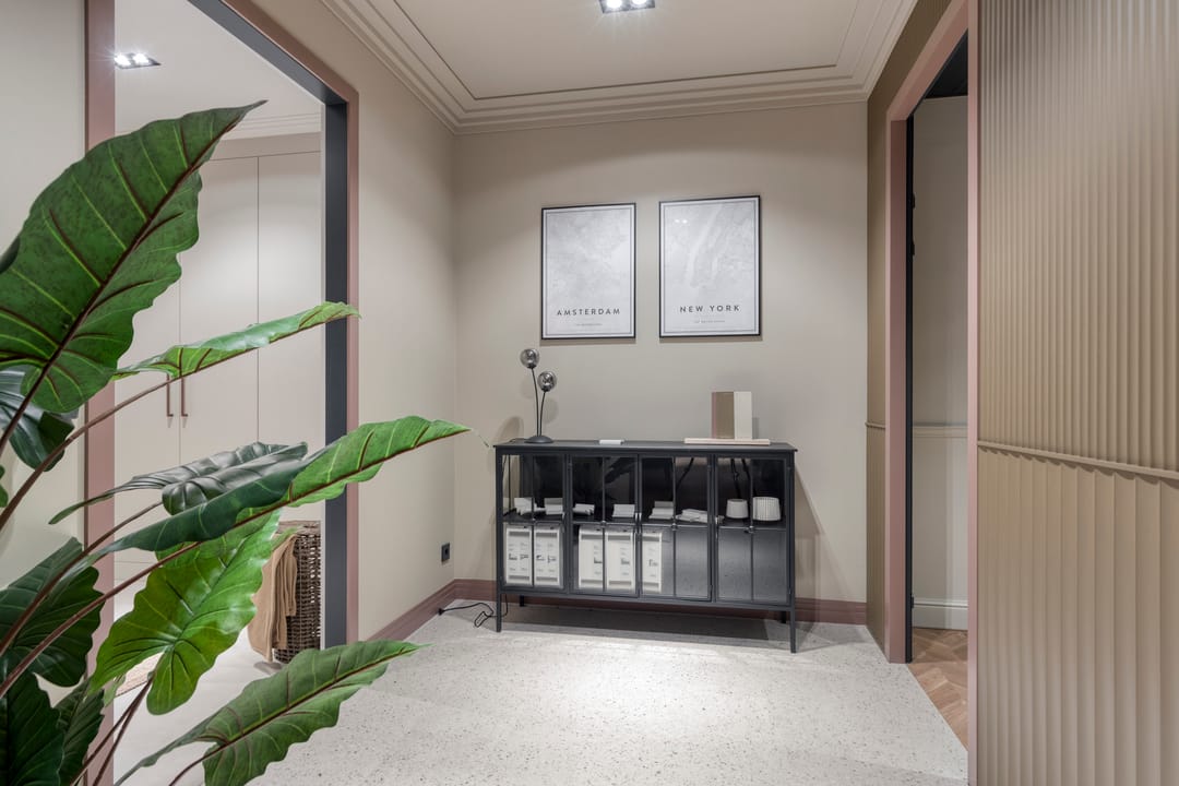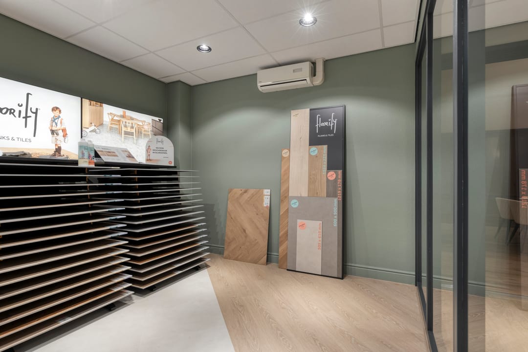 Betonnen vloer gedekt met pvc, afgewerkte wanden en systeemplafond met inbouwarmatuur.