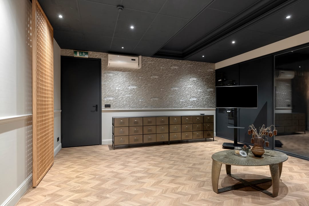 Betonnen vloer gedekt met pvc, afgewerkte wanden en systeemplafond met inbouwarmatuur, airco en mechanische ventilatie.