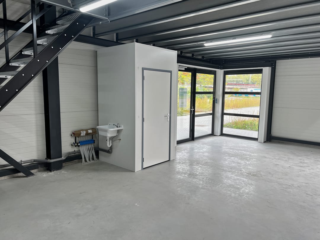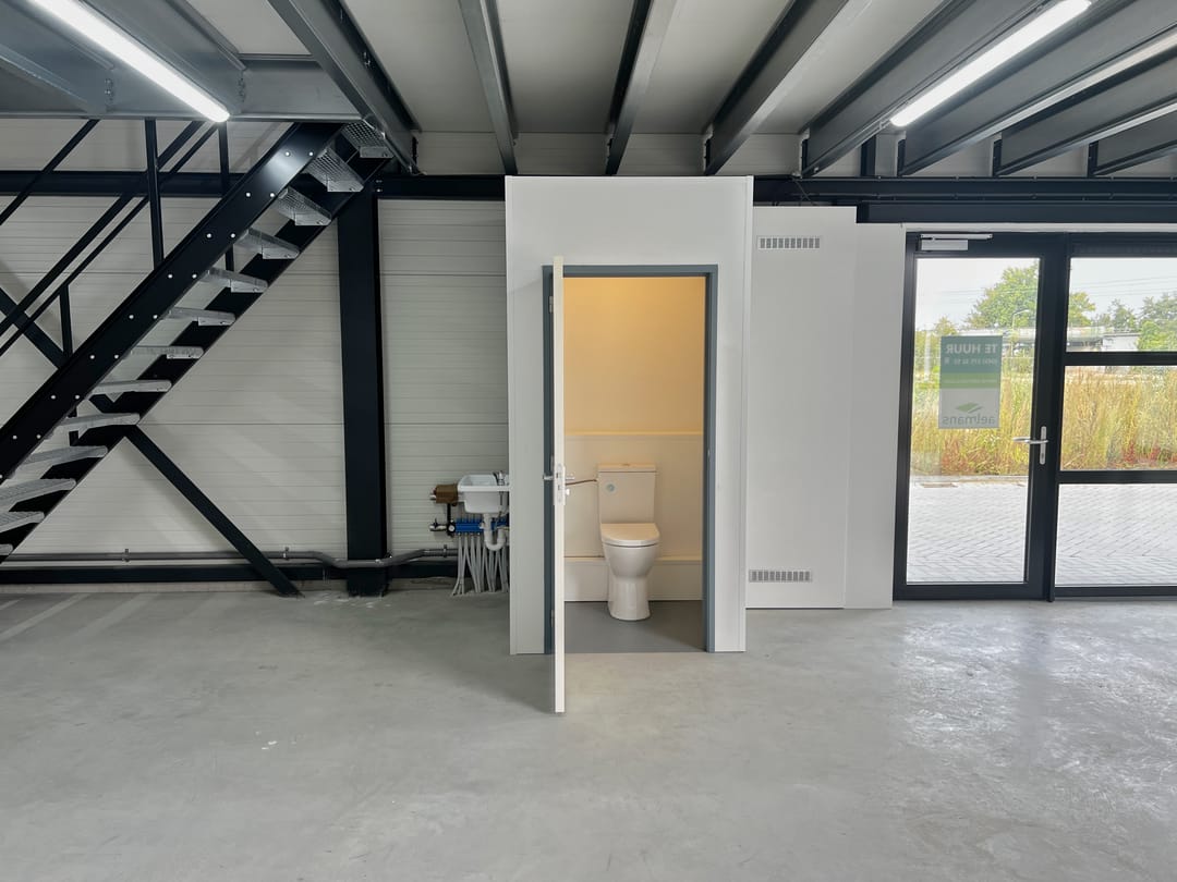 Deze bedrijfsunit is al reeds voorzien van een toilet, separate wasbak, voorbereiding vloerverwarming, verlichting en diverse stroompunten.