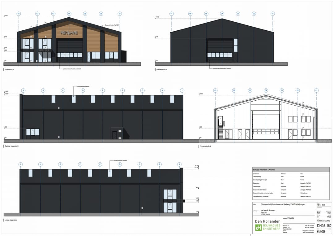 - Aan de voorzijde een nieuw te plaatsen elektrisch bedienbare overheaddeur van 6.00 meter breedte;