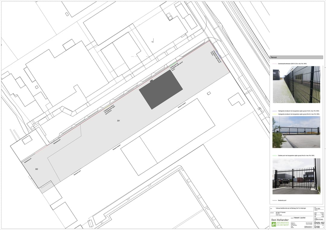 - Op twee plaatsen een elektrisch bedienbare schuifpoort, voorzijde een poort met een breedte van 10 meter, rechter zijde een (handmatig bedienbare) poort met een breedte van 4 meter en een poort met een breedte van 8 meter (elektrisch);