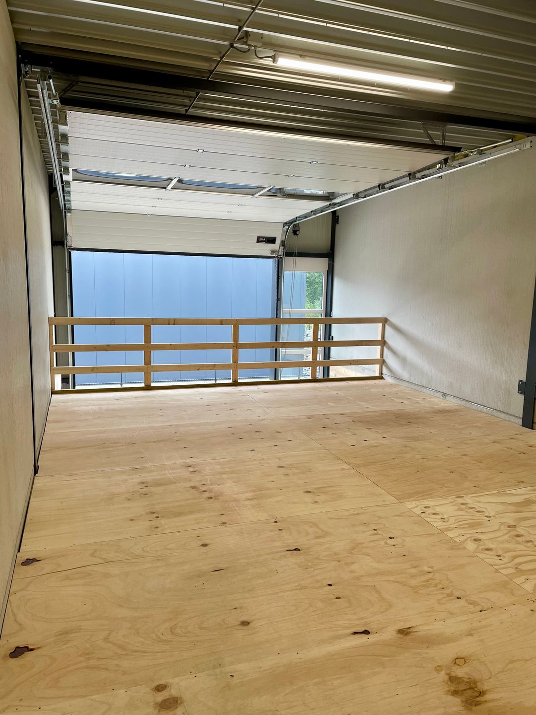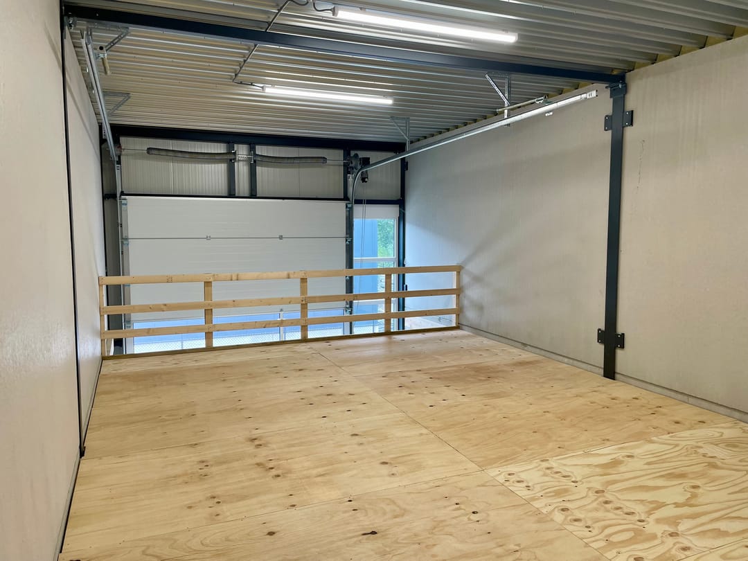 Achter in de ruimte leidt een vaste trap naar de eerste verdieping. Deze verdieping is voorzien van een houten dekvloer, een balustrade en tl-verlichting. De hoogte van de verdieping tot aan het dak bedraagt circa 3,12 meter.