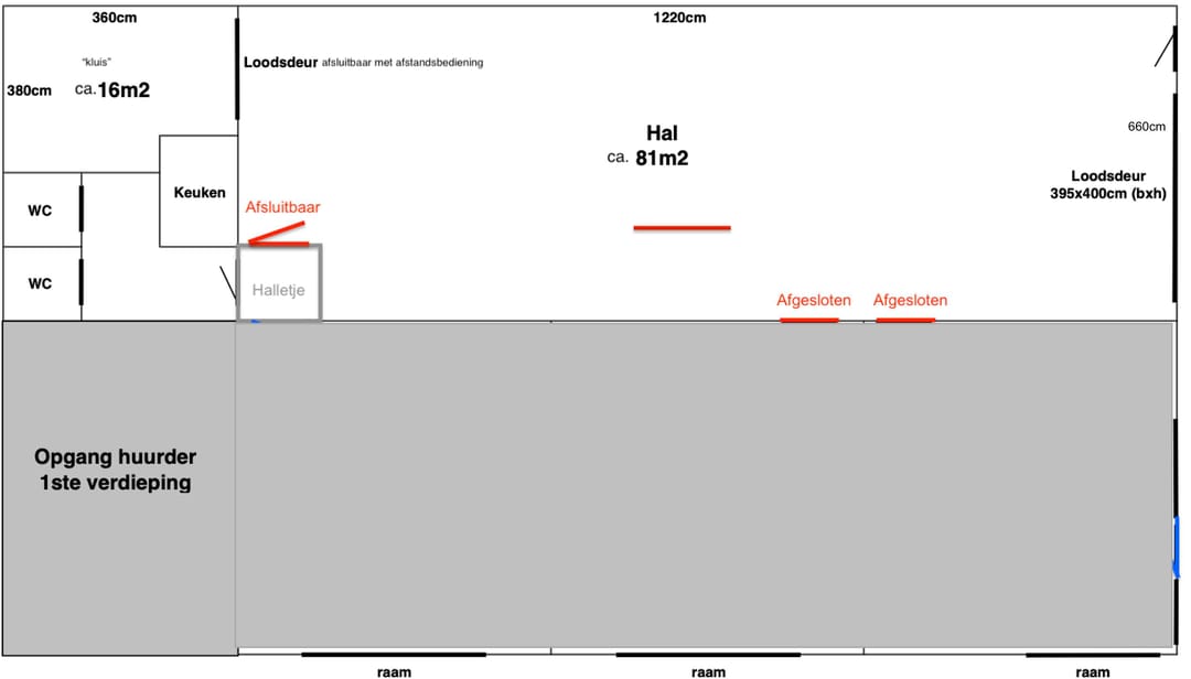 - Overheaddeuren, krachtstroom, betonvloer, toilet en pantry