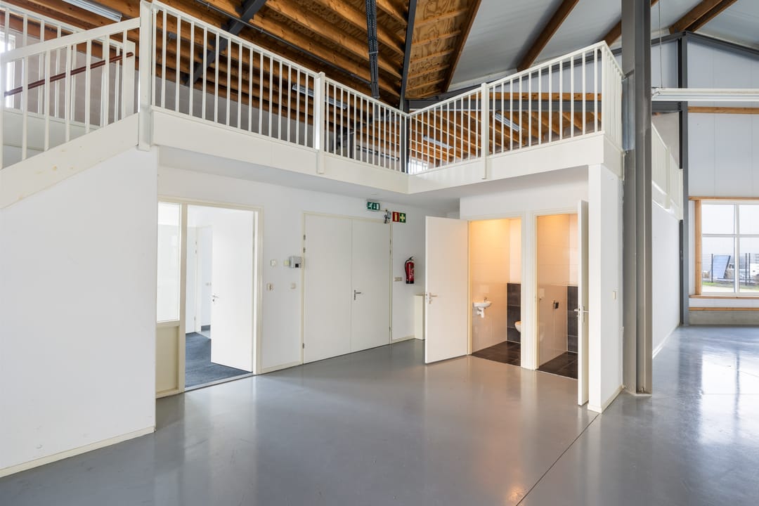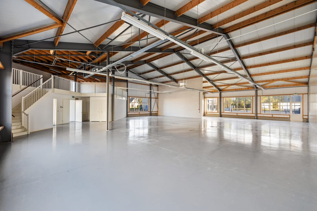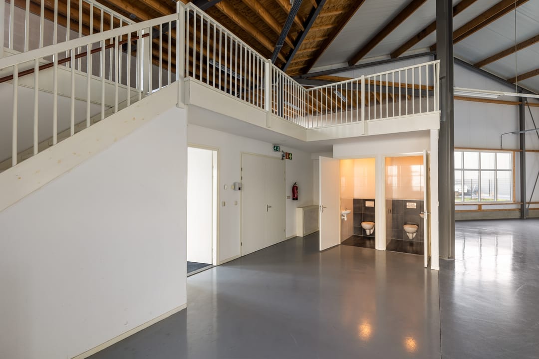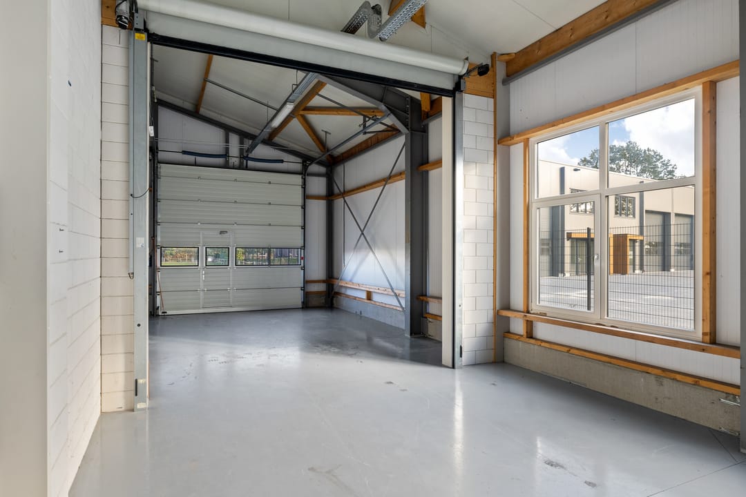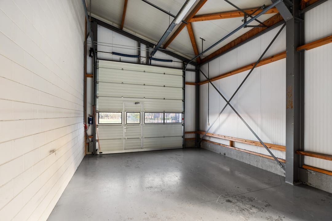 De bedrijfshal is uitgevoerd met een elektrische overheaddeur en bergzolder (circa 90 m²)