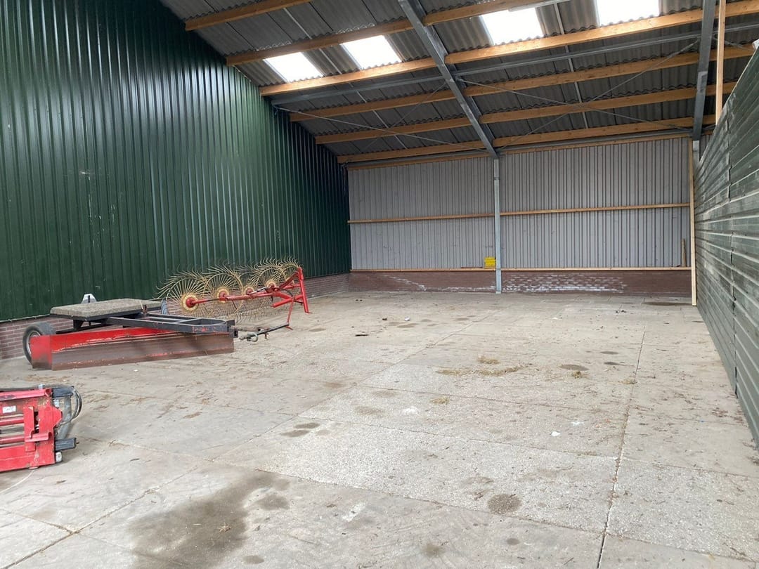 • Betonplaten vloer, gevels damwandplaten, gegalvaniseerde stalen spanten met houten gordingen, golfplaten dak met enkele lichtplaten.