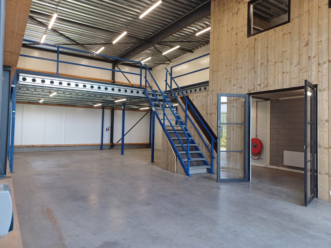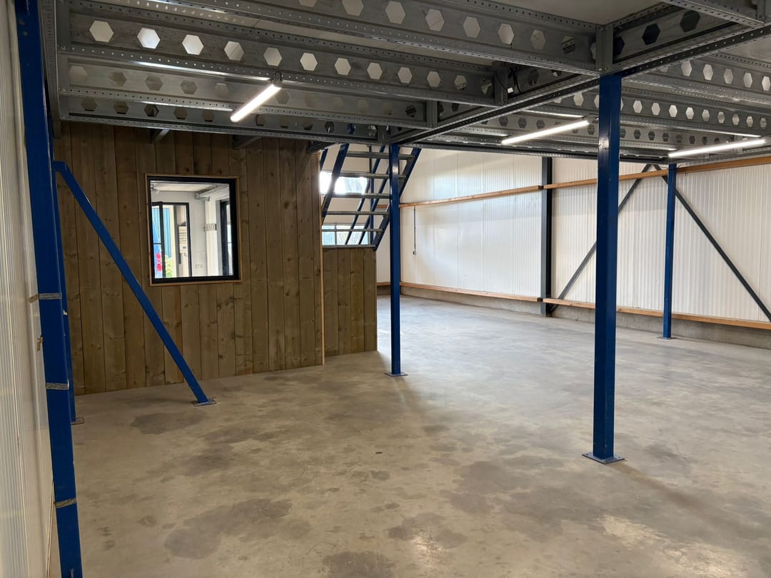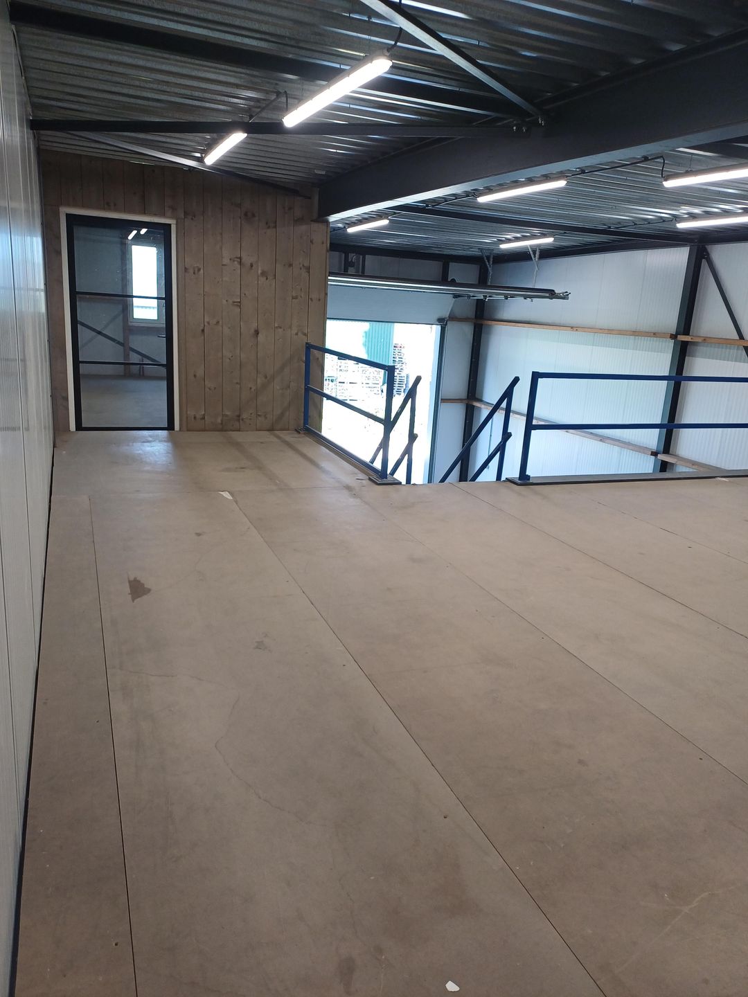 Verdieping: middels stalen trap te bereiken ruimte voor tweede kantoor (betonvloer) van ca. 16 m², entresolvloer (ca. 54 m²).