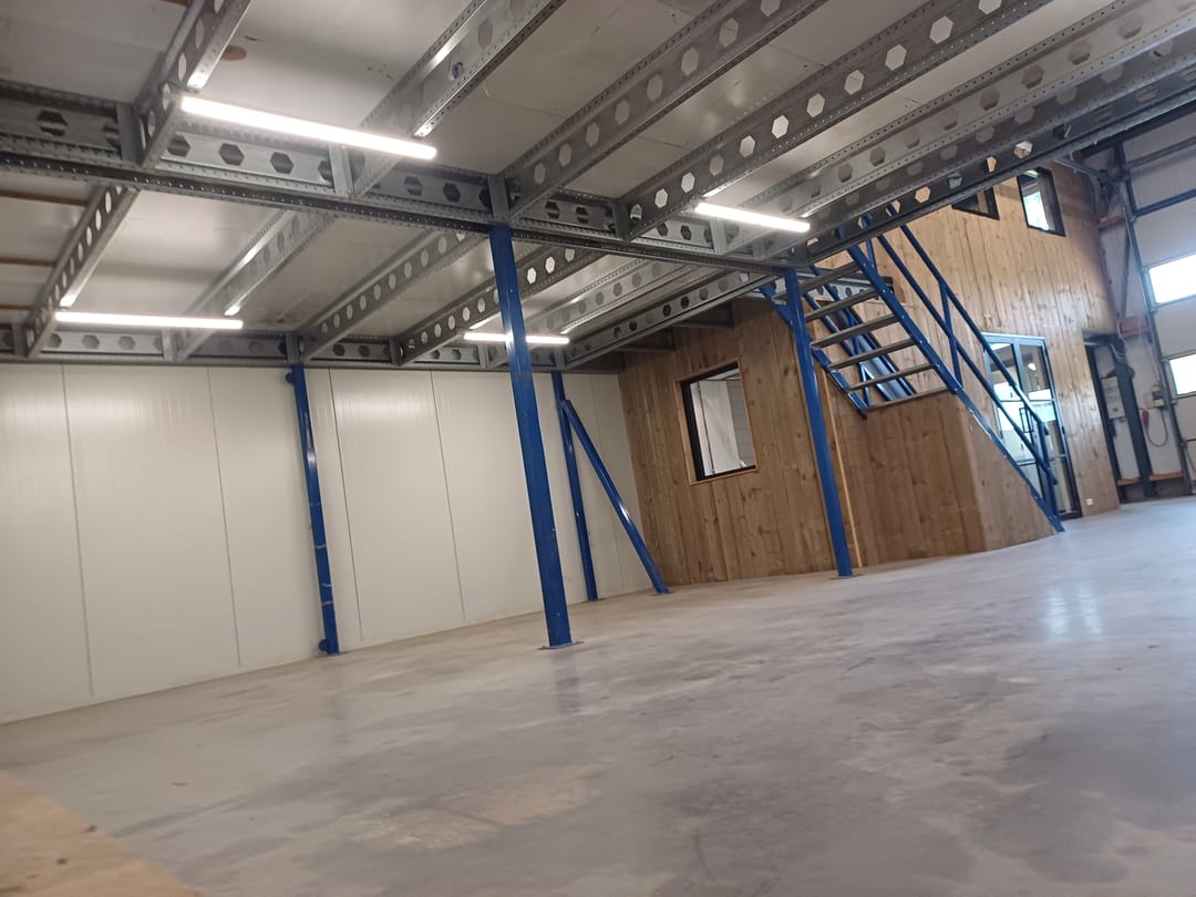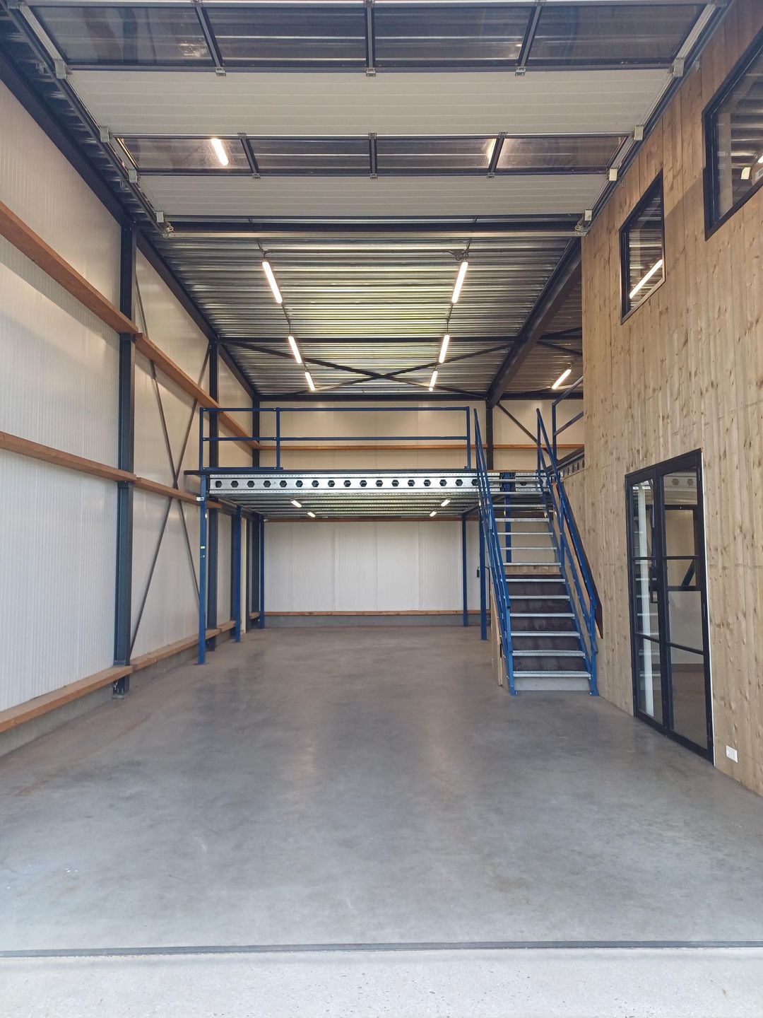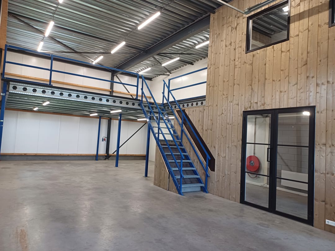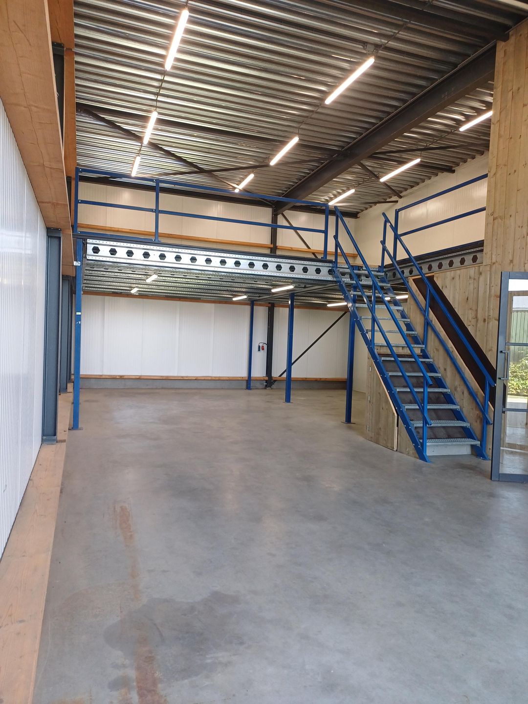 Verdieping: middels stalen trap te bereiken ruimte voor tweede kantoor (betonvloer) van ca. 16 m², entresolvloer (ca. 54 m²).