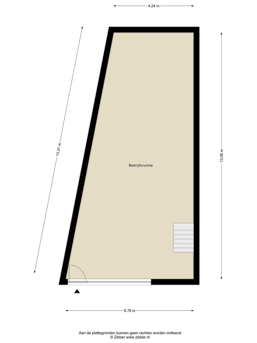 De bedrijfsruimte is via de loopdeur of handmatige geïsoleerde roldeur te bereiken. De begane grondvloer betreft een open ruimte welke vrij in te delen is, de beschikking heeft over een betonnen vloer en waar rechts achterin zich de meterkast met tussenmeters bevindt.