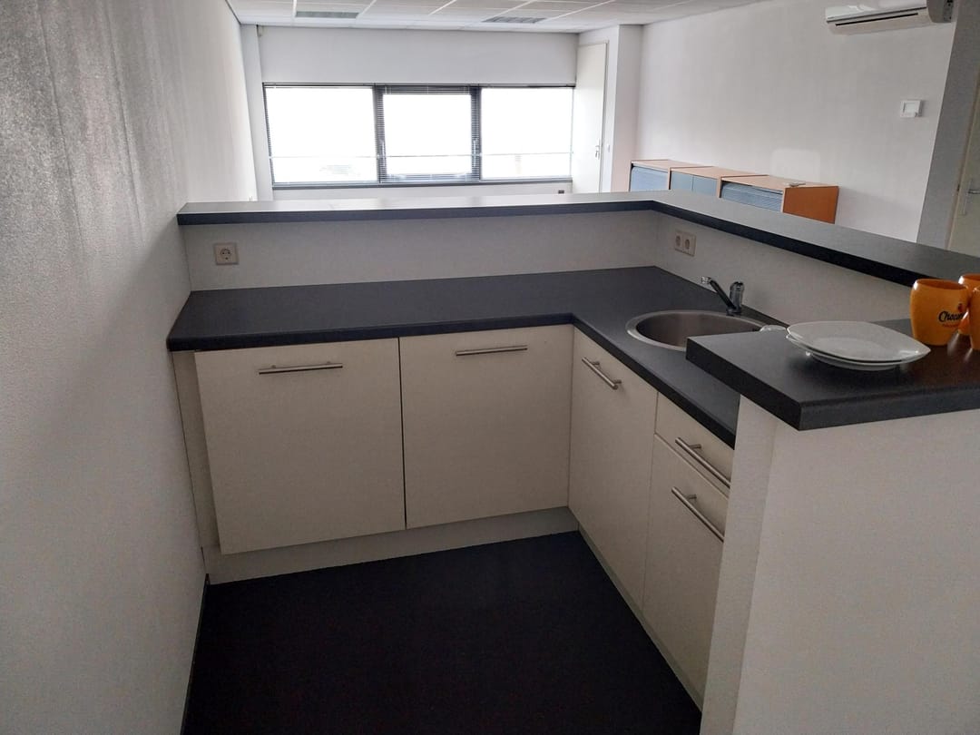 De eerste verdieping is een gestoffeerde kantoorruimte, met reeds aanwezige archiefkast en opbergruimte, boiler, airconditioning unit, keuken met koelkast, TL-inbouwverlichting, aansluitingen elektra, centrale verwarming, brandblusmiddelen, systeemplafond, jaloezieën,