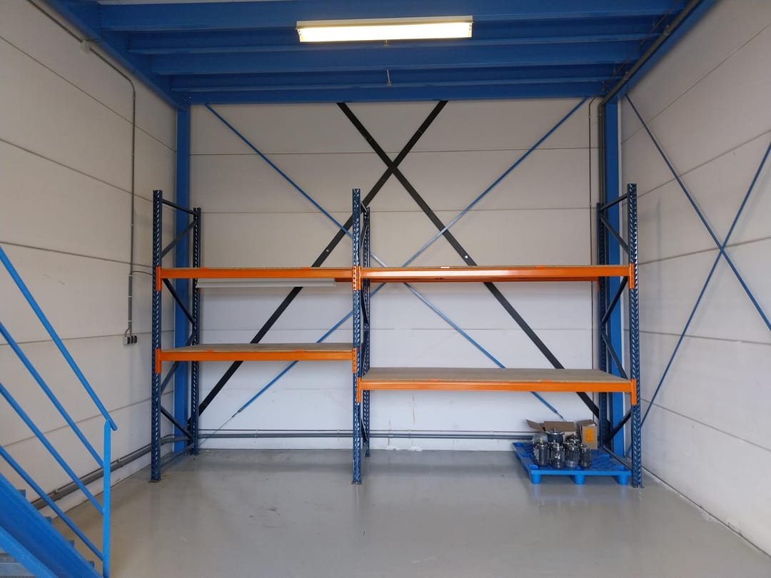 De begane grond is voorzien van een recent gegoten betonvloer, handmatige overheaddeur, krachtstroom, alarminstallatie, toilet, 2 grootvakstellingen over de gehele breedte van het pand inclusief legborden, brandblusmiddelen.