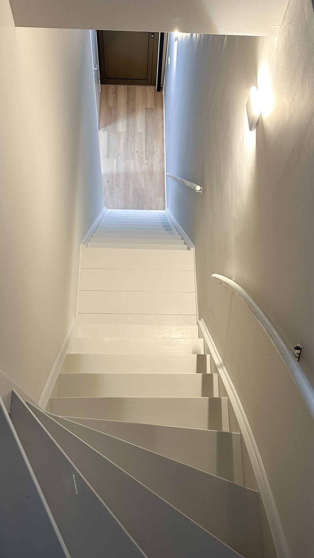 - Gestukte en geverfde entree met wandverlichting, droogloopmat en PVC vloer