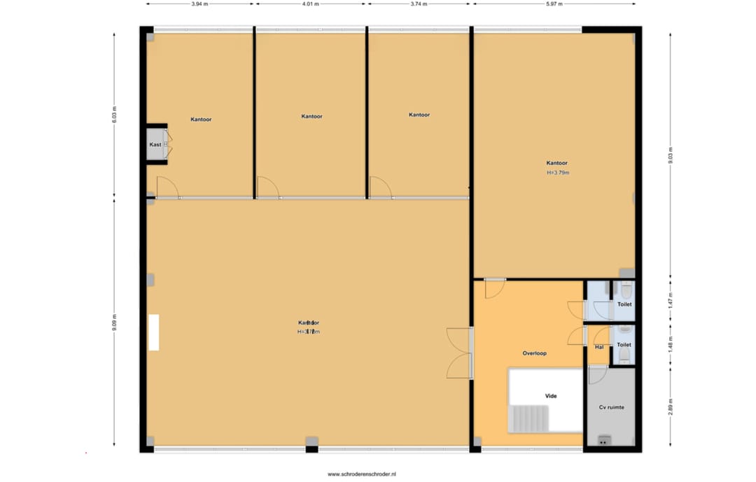 - Totaal BVO: ca. 800 m², onderverdeeld in: