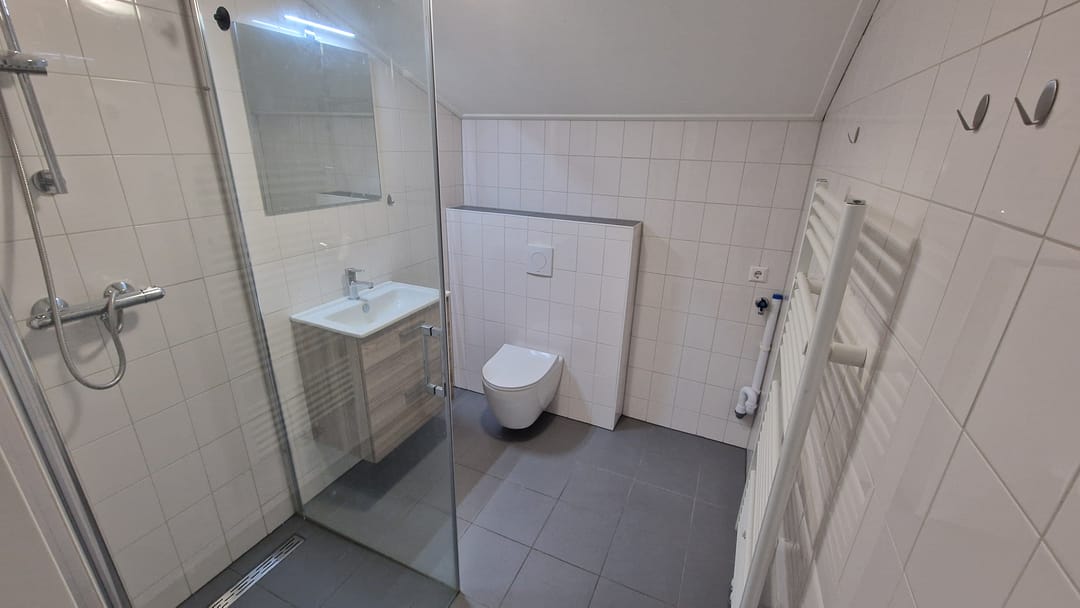 Op de eerste verdieping is er de mogelijkheid om te wonen in het appartement hier is een woonkamer met open keuken voorzien van gaskookplaat, afzuigkap en vaatwasser. 2 slaapkamers en nette douche ruimte met douche, toilet en wastafel.