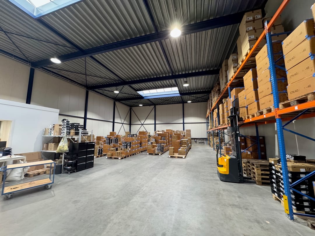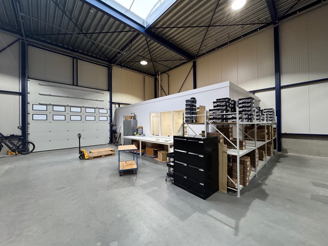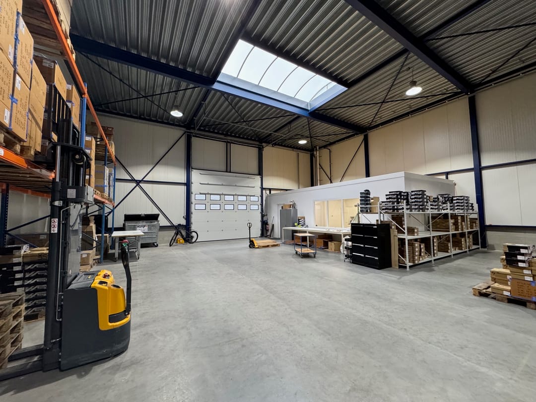 - Lichtstraten, overheaddeuren, betonvloer, toilet, pantry, inbouwarmaturen en te openen ramen