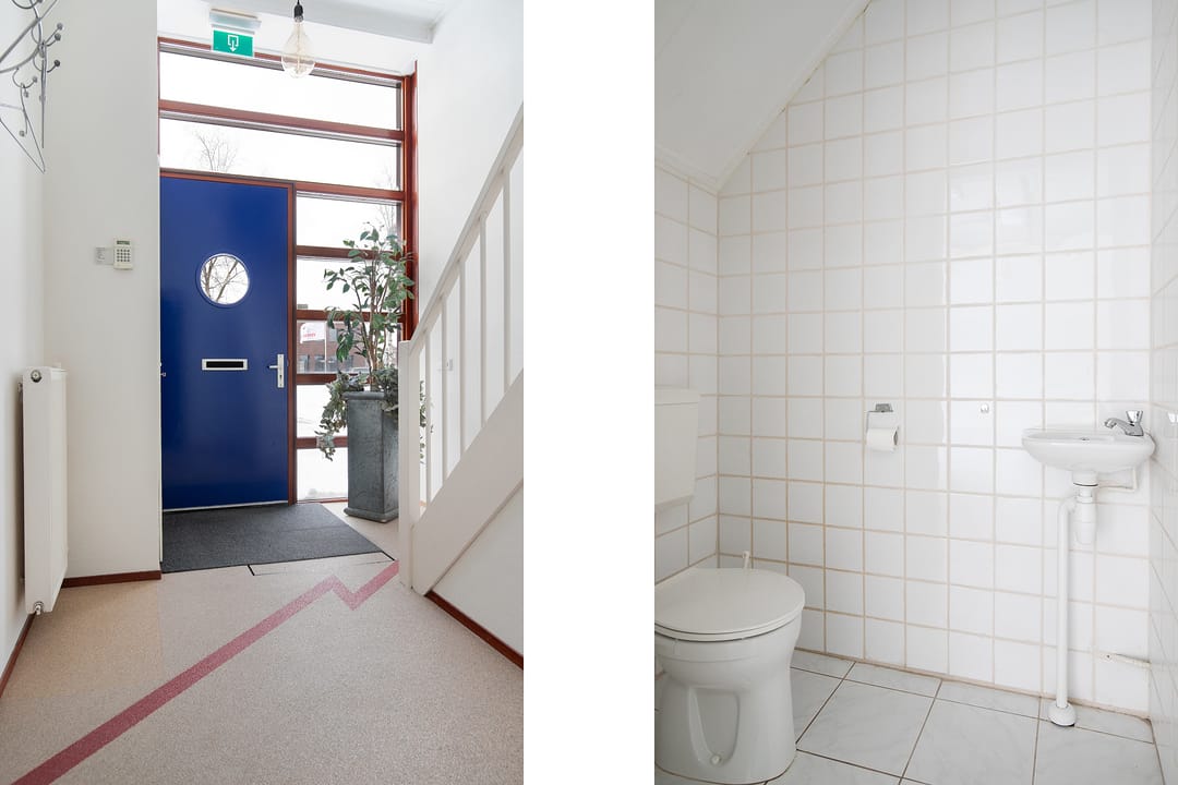 Begane grond: entree met meterkast, alarminstallatie en trap naar eerste etage. Toegang tot bedrijfsruimte met dubbel toilet, wastafel, werkbank, verwarming, omvormer zonnepanelen, elektrische overheaddeur en een extra trap naar de eerste etage aan de achterzijde.