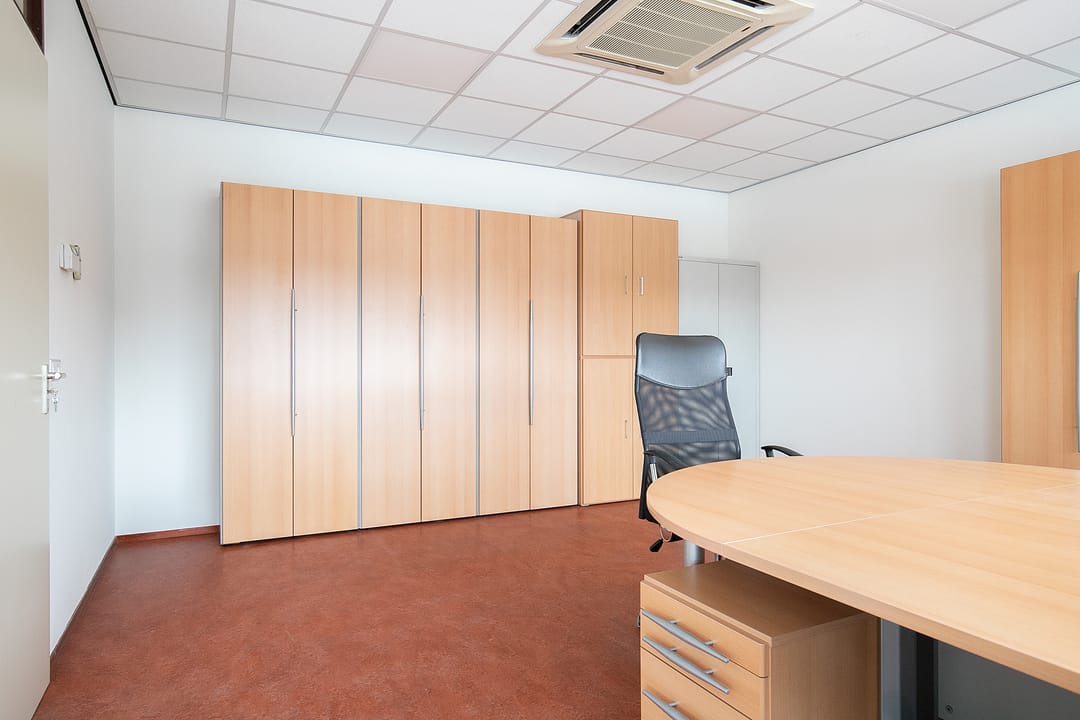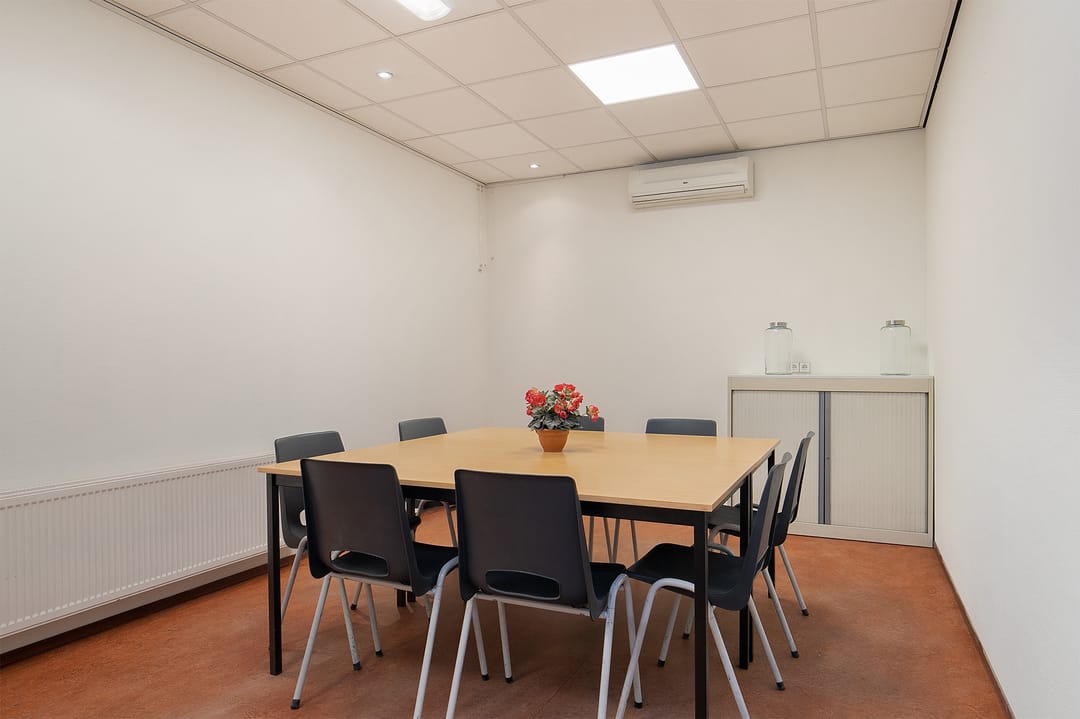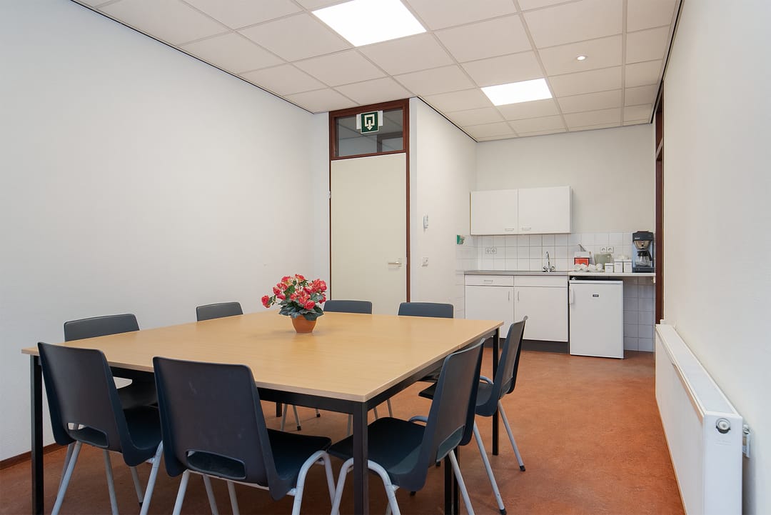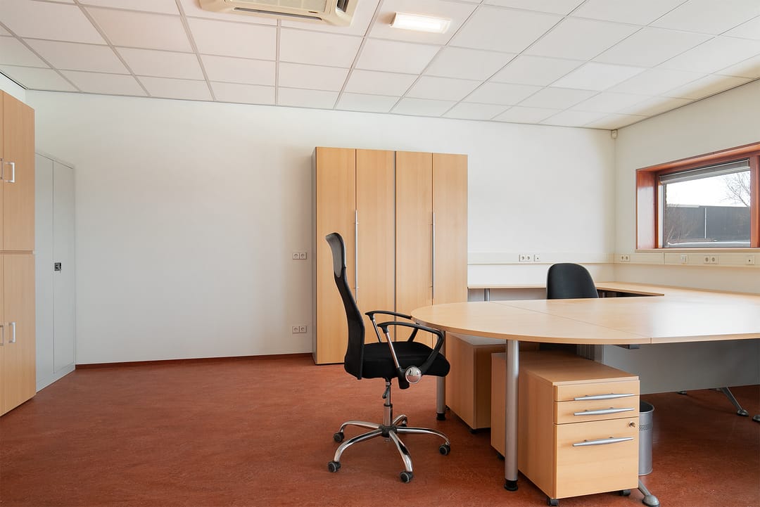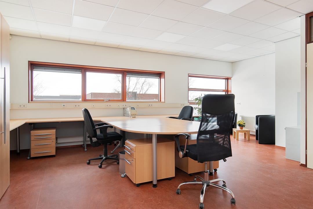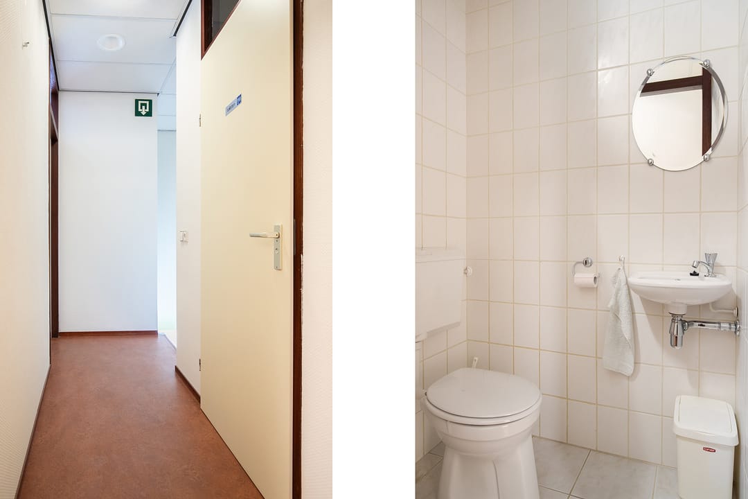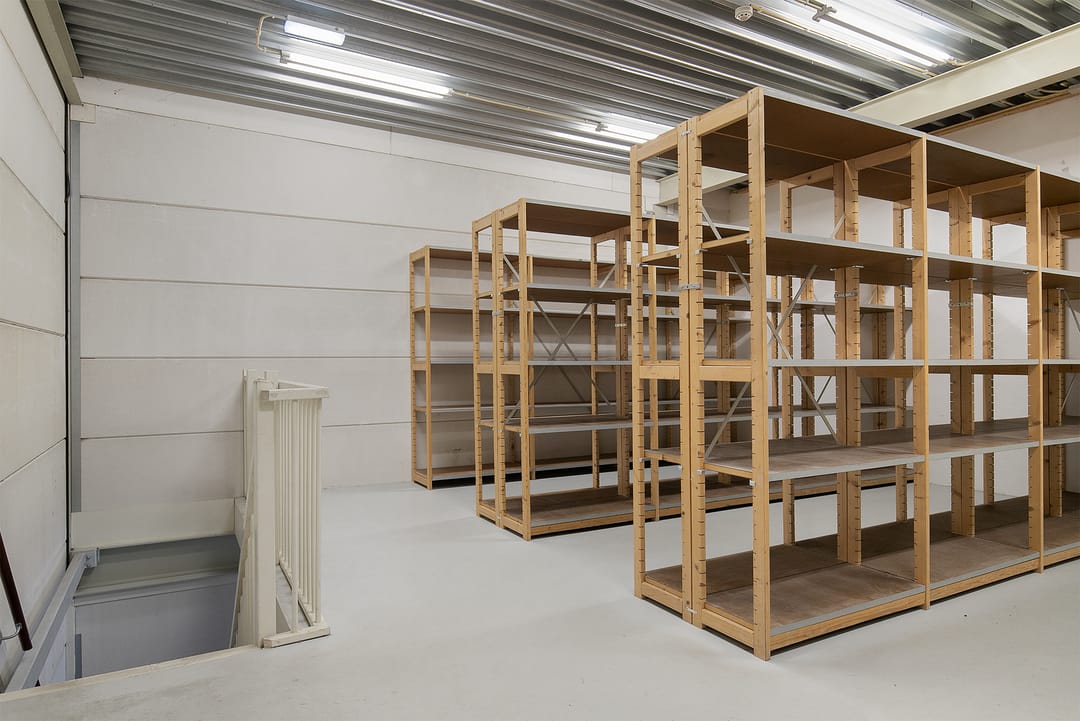Eerste etage: overloop met toilet en cv ruimte, kantoorruimte aan de voorzijde met airco, kabelgoten en verlichting. Centraal een pantry met koelkast en een magazijnruimte met direct toegang tot de bedrijfsruimte op de begane grond.