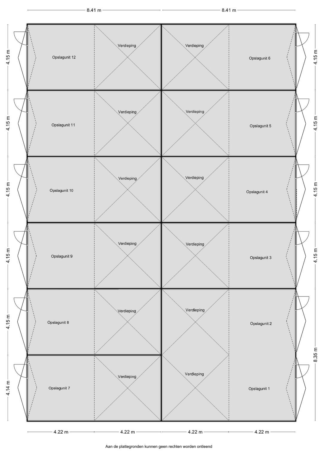 De onderhoudsarme unit is voorzien van een betonvloer (max. 1.000 kg/m²) en een houten verdiepingsvloer (max. 250 kg/m²). De bovenkant van de verdiepingsvloer ligt op ± 3.50 m. De gevels bestaan uit geïsoleerde metalen gevelbeplating en op het dak komen geprofileerde sandwich dakpanelen. De overheaddeur heeft een breedte van circa 3.65 m en een hoogte van ongeveer 3.50 m en is elektrisch bedienbaar. Verder heeft de unit standaard een rioolaansluiting (achterin de hoek van de opslagunit) en een aansluiting op water en elektra (tot in de meterkast).