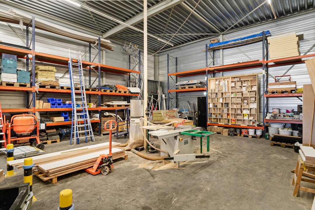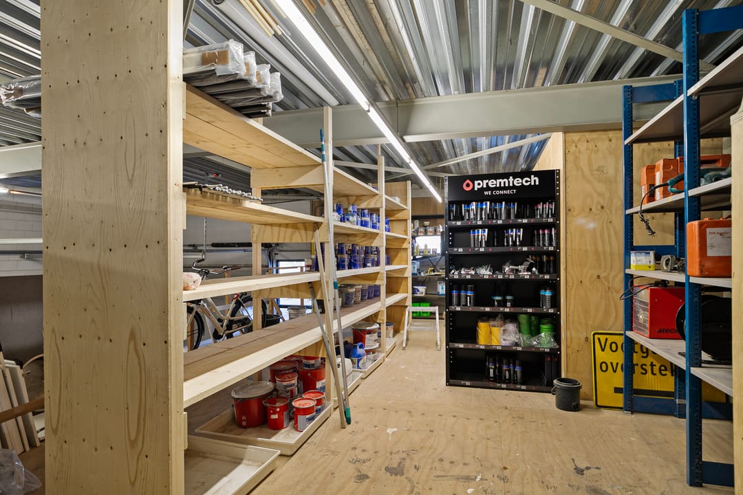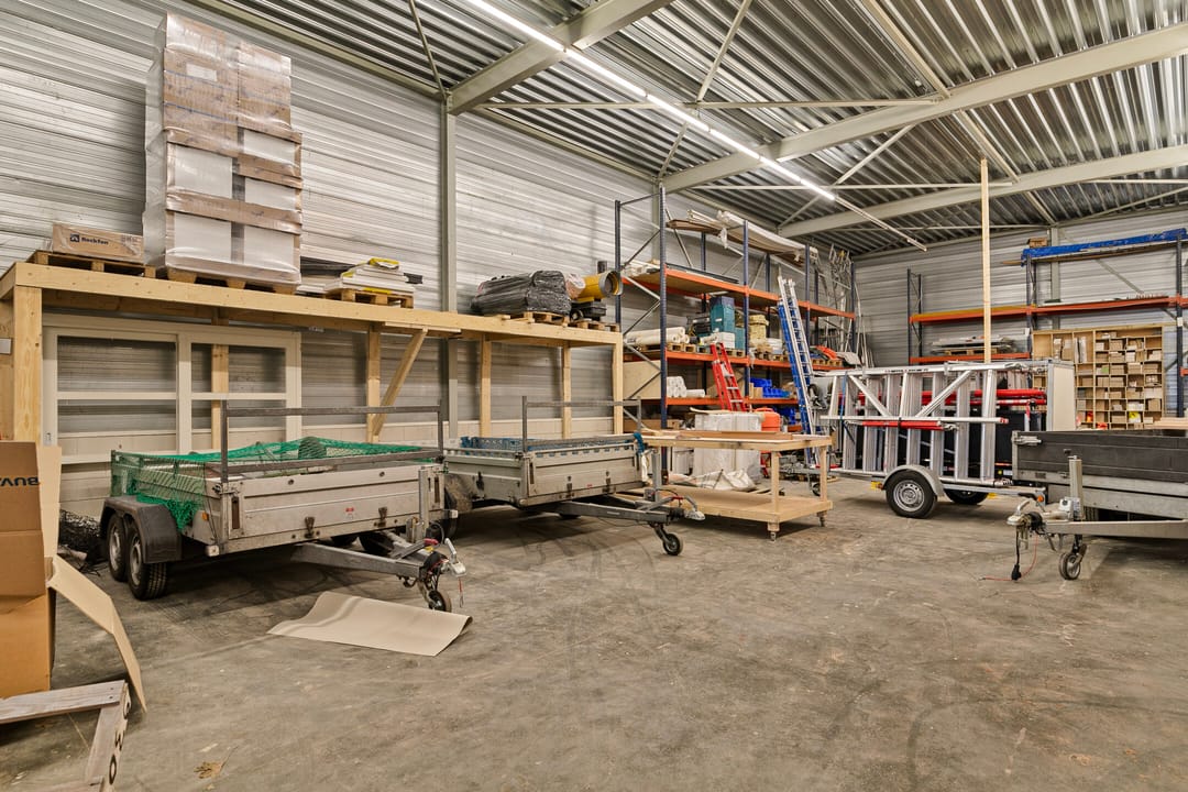 - Overheaddeuren, betonvloer, toilet, pantry, inbouwarmaturen en te openen ramen