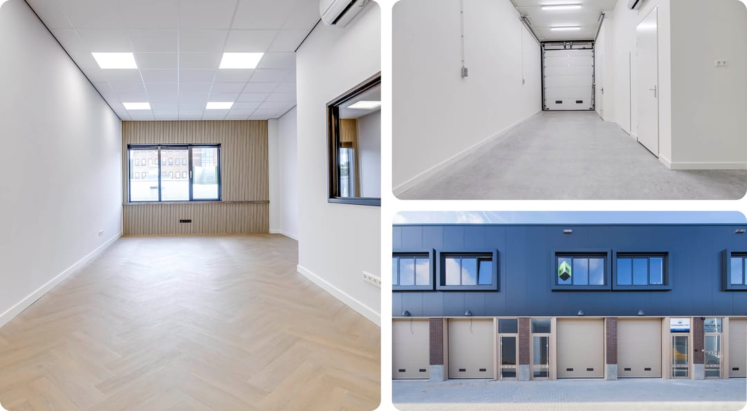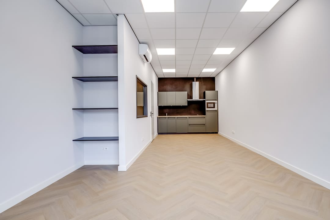 Wanneer je deze bedrijfsunit via de separate loopdeur of de elektrisch bedienbare overheaddeur betreedt, word je verrast door het hoogwaardige opleveringsniveau. De ruimte is instap klaar: jouw meubels en decoratie erin en je kan direct starten met werken. De begane grond is voorzien van een gevlinderde vloer, de wanden zijn glad gestuukt en wit afgewerkt en voorzien plinten, er zijn elektrapunten aangebracht, voldoende ledverlichtingslijnen en mooie toiletruimte.