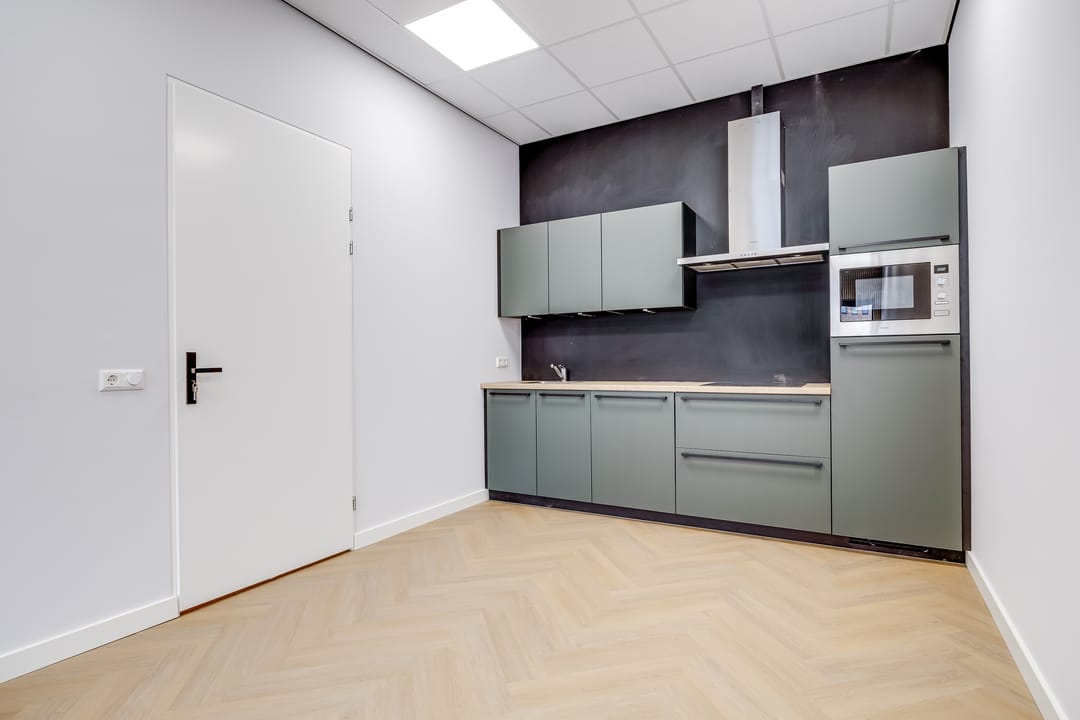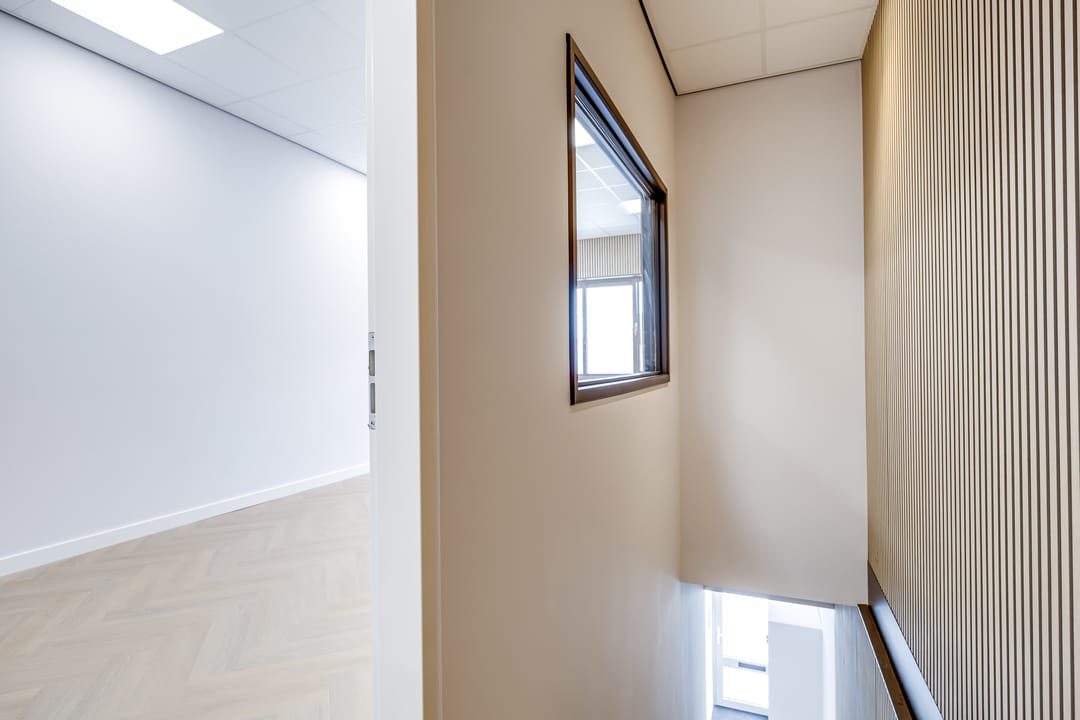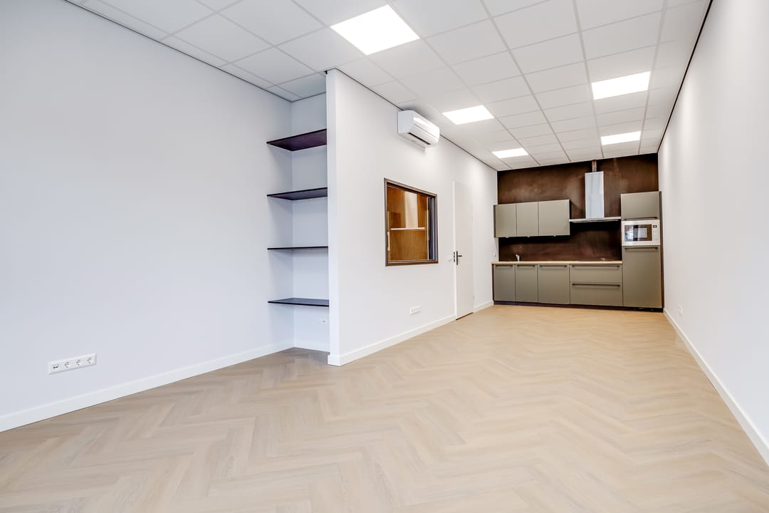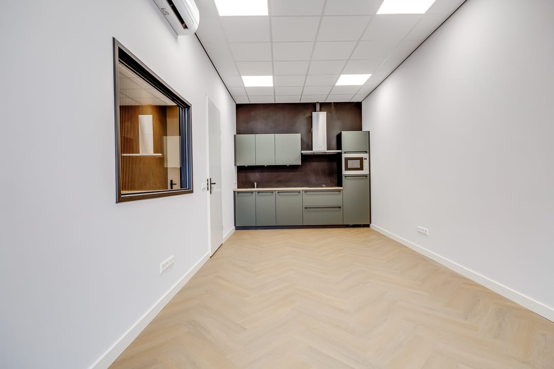 De prachtig met pvc beklede trappartij en stalen design leuning brengt je naar de stijlvolle kantoorruimte op de eerste verdieping. Deze verdieping is voorzien van een pvc-vloer, de wanden glad gestuukt en gespoten en zijn er voldoende elektra- en datapunten. Enkele wanden zijn voorzien van houten wandpanelen. De moderne keuken wordt opgeleverd in mineraal groen met luxe zwarte grepen en greep loze bovenkasten (v.v. verlichting). De luxe keuken is voorzien van diverse apparatuur en accessoires. Voor voldoende licht op de verdieping is er dimbare verlichting aangebracht. Ook is hier nog een mooie toiletruimte gerealiseerd. De bedrijfsunit is volledig voorzien van airco voor verwarmen en koelen van de ruimte.