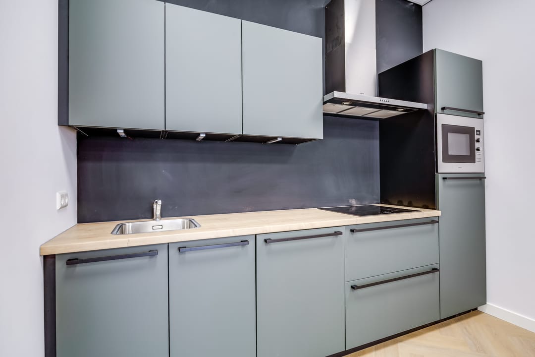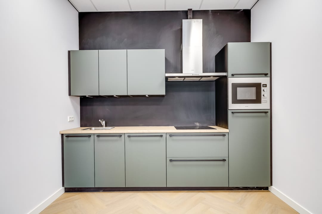 • moderne luxe keuken in mineraal groen met luxe zwarte grepen en greep loze bovenkasten v.v. diverse apparatuur (Combimagnetron, inductiekookplaat, vaatwasser, koel-vriescombinatie, afzuigkap), spoelbak met kraan en luxe ledspots (incl. trafo);