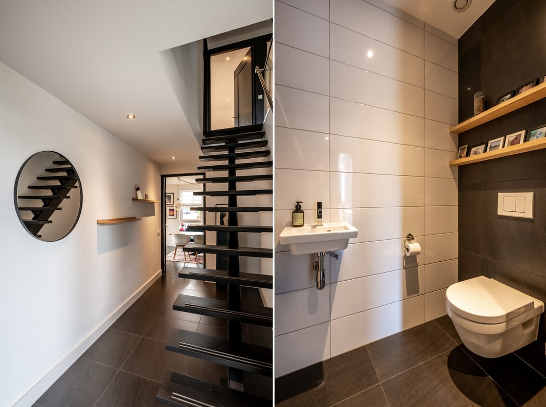 De afwerking van de begane grond is strak en modern met een tegelvloer met VLOERVERWARMING én VLOERKOELING, gestucte wanden en plafonds, ISOLERENDE beglazing en een stijlvolle inrichting. De living vormt een sfeervol geheel waar u zich direct thuis zult voelen.