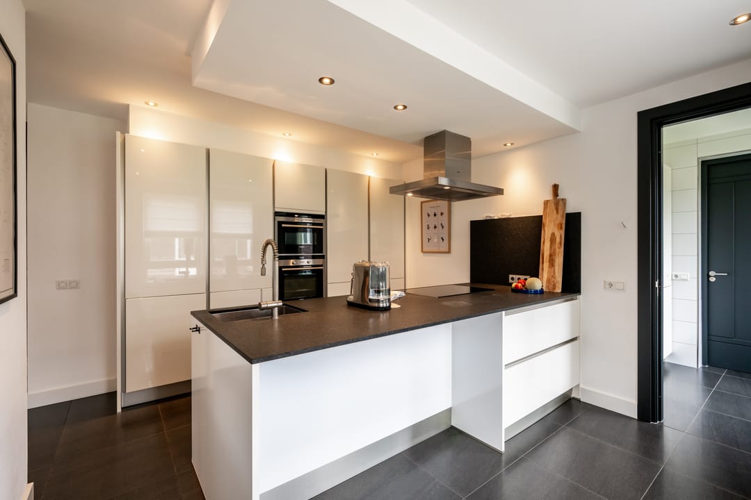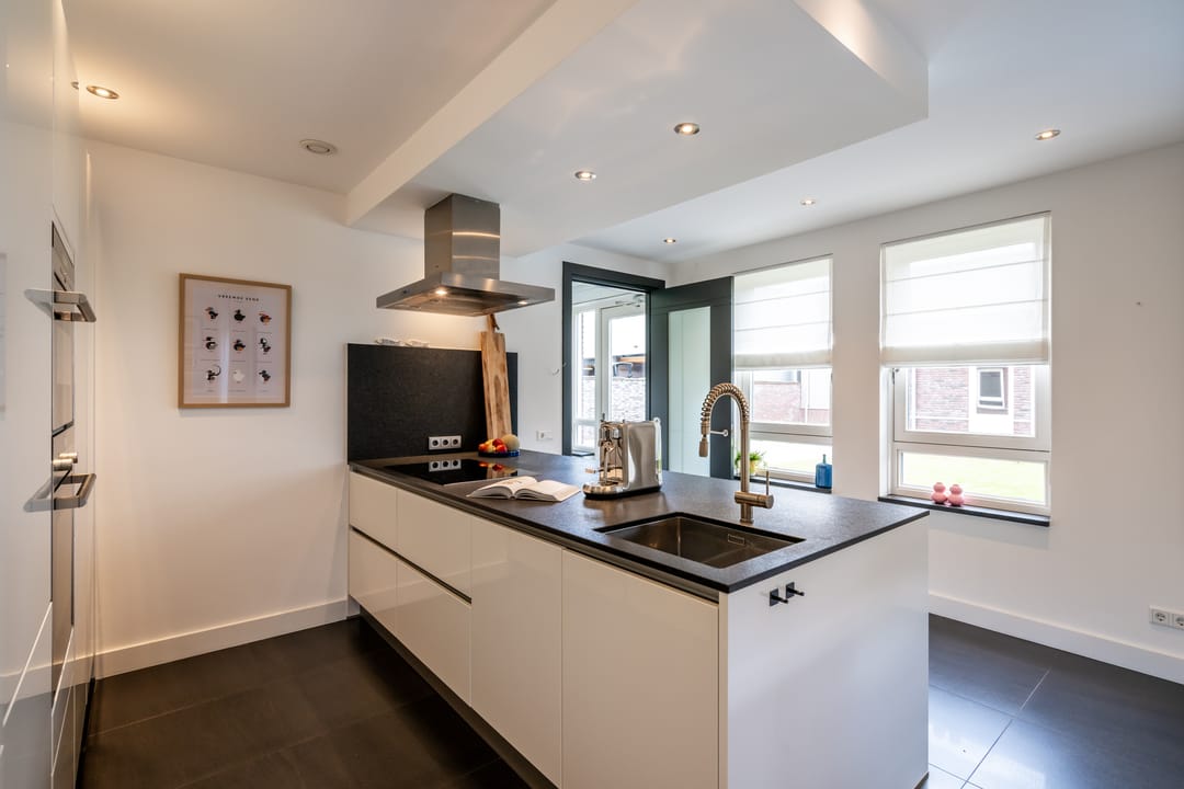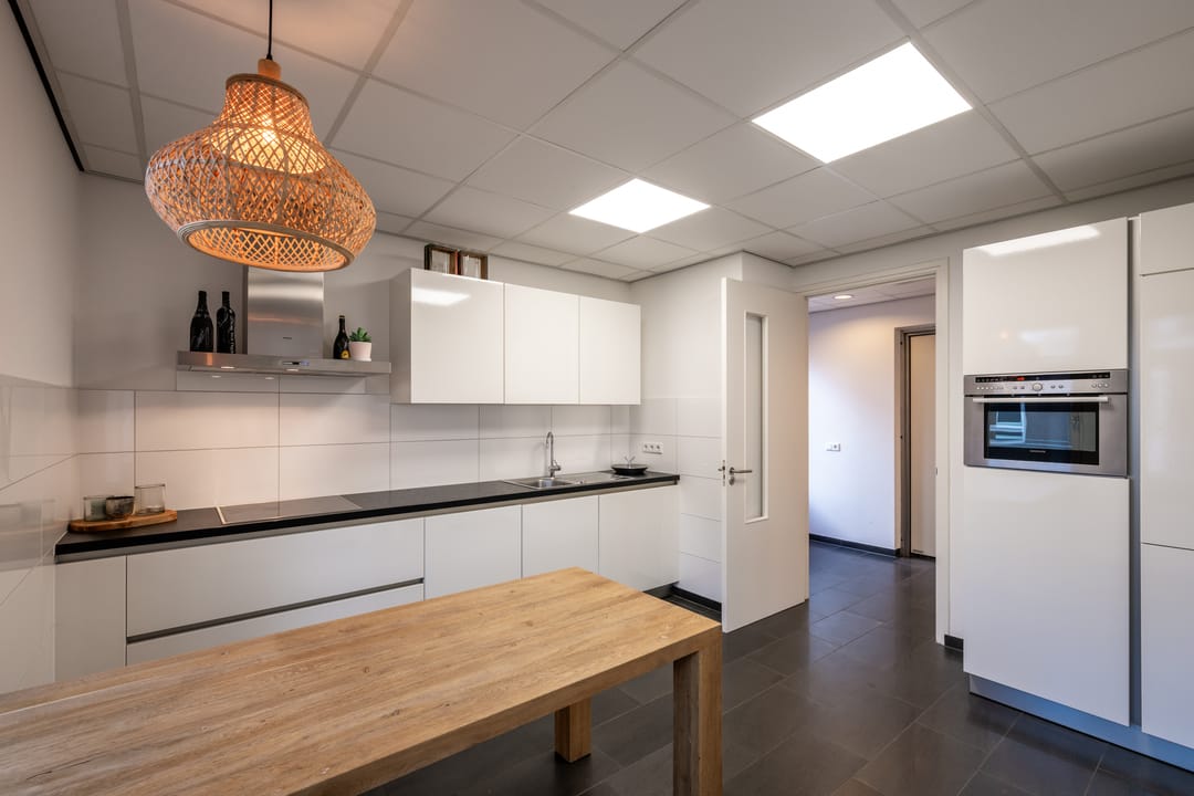 De keuken treft u aan de achterzijde van het huis en is een echte blikvanger. Uitgevoerd in wit hoogglans met greeploze fronten en een gebrand GRANIETEN werkblad Ademt deze ruimte rust, kwaliteit en modern wooncomfort.