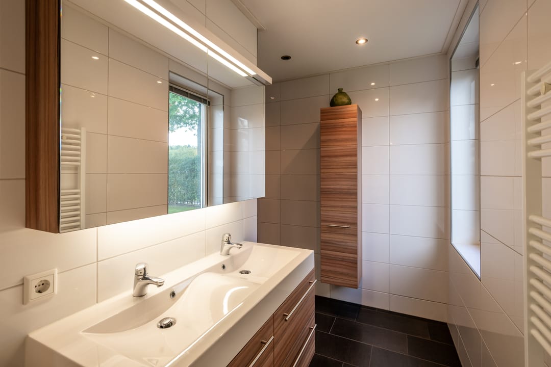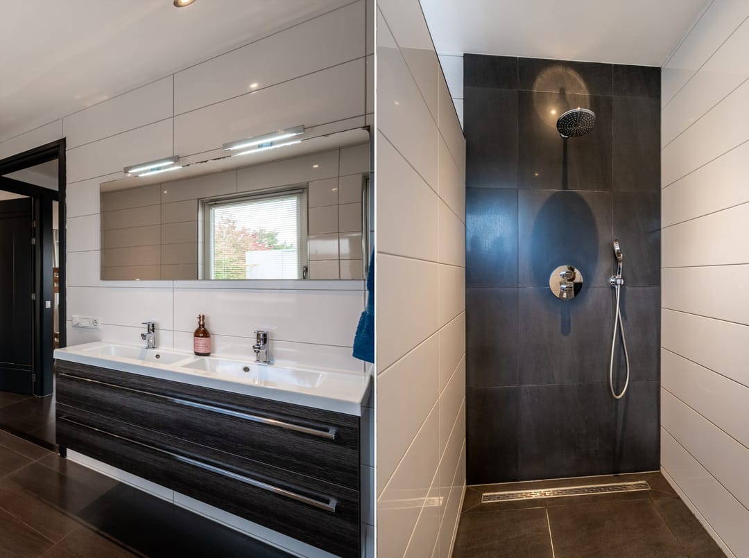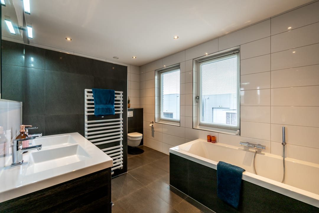 • Complete badkamer met ligbad, douche, dubbele wastafel en toilet