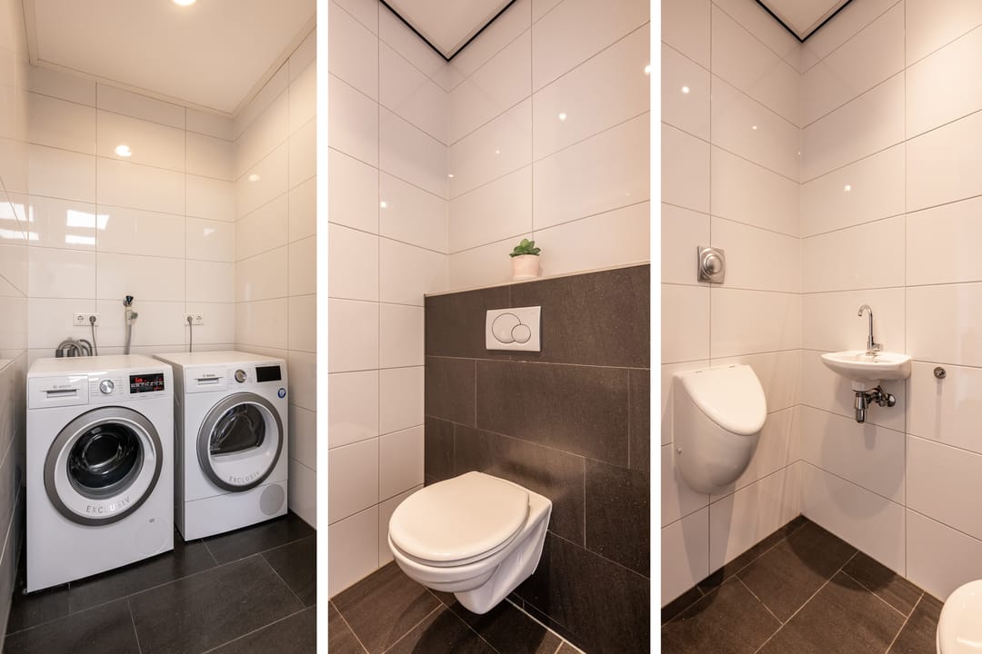 Aan de voorzijde van de hal bevindt zich een afzonderlijke KANTOORRUIMTE met eigen entree. Deze ruimte is volledig afgewerkt en voorzien van een tegelvloer met VLOERVERWARMING en diverse faciliteiten zoals een KEUKENblok met combi-oven, koelkast, vriezer, 4-pits inductieplaat en vaatwasser, een BADKAMER met inloopdouche en dubbel wastafelmeubel, een separaat toilet en een aparte wasruimte met witgoedaansluitingen.