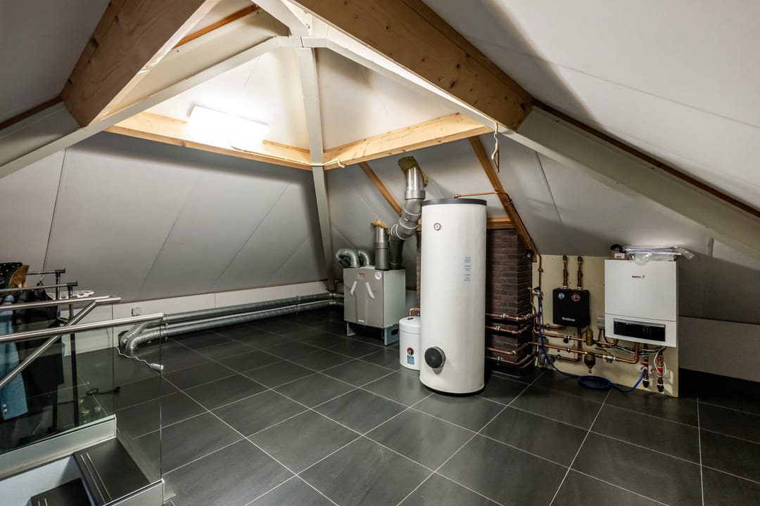 De ZOLDERverdieping is bereikbaar via een vaste trap. Deze ruimte is volledig betegeld en voorzien van de technische installaties, waaronder de WARMTEPOMP, boilers en WTW-unit. Er is nog geen daglicht aanwezig, waardoor de ruimte ook niet mee telt in het woonoppervlak. Met de toevoeging van een DAKRAAM kan deze ruimte eenvoudig worden omgevormd tot extra slaapkamer of hobbyruimte, waarna deze ook meetelt in het woonoppervlak.