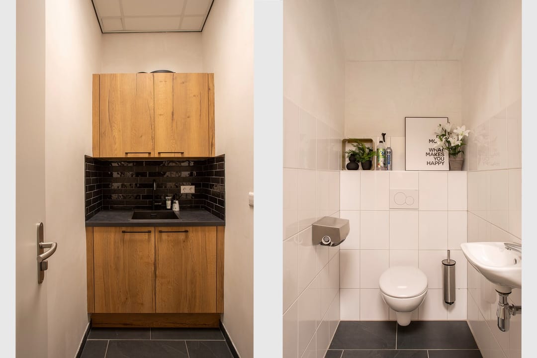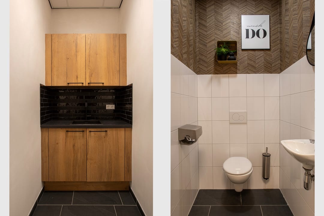 • Trapkast, pantry en modern hangtoilet (halfhoog betegeld, fonteintje)