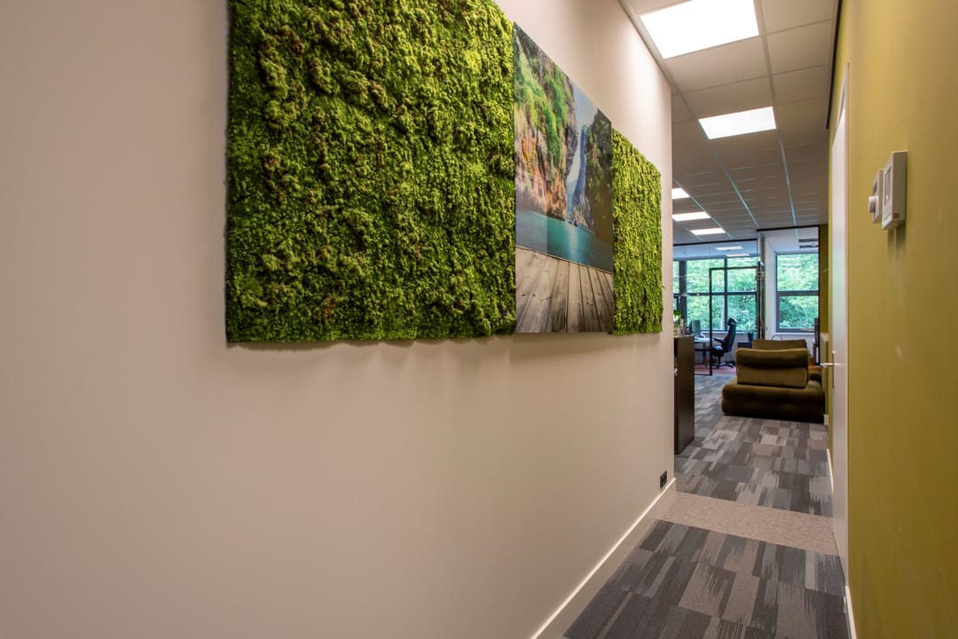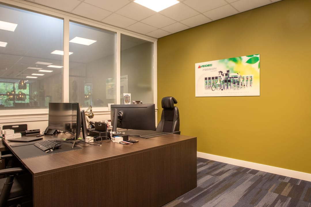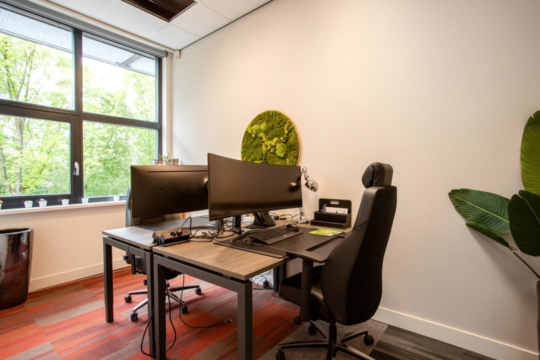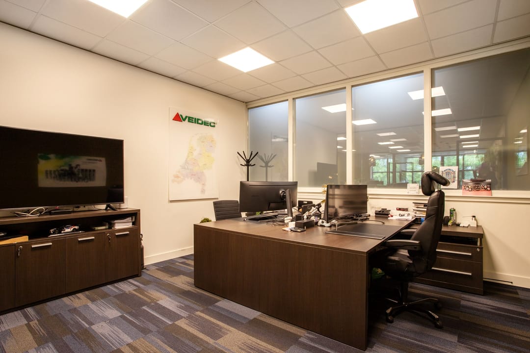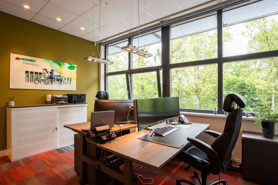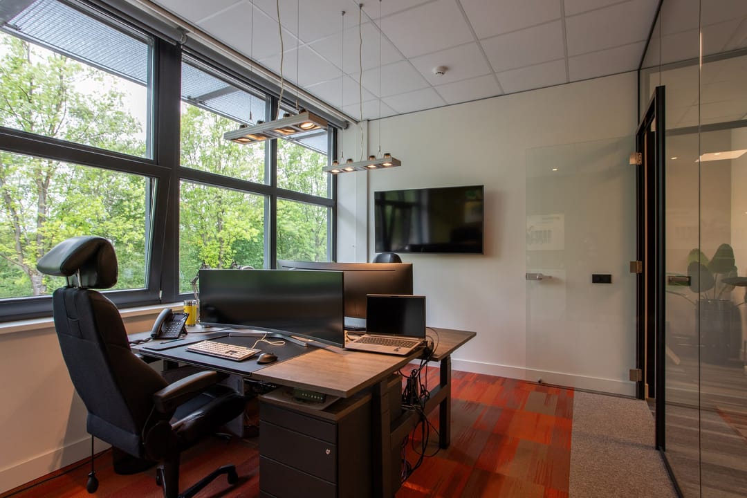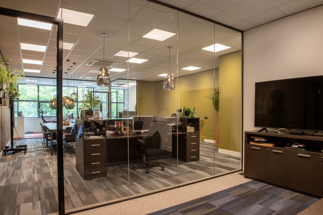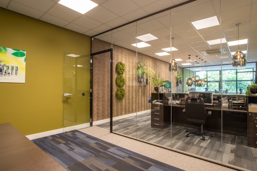 • Achterzijde: royaal kantoor met glazen wandafscheiding