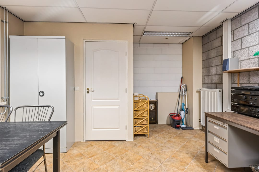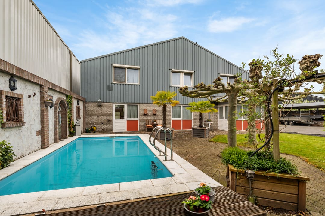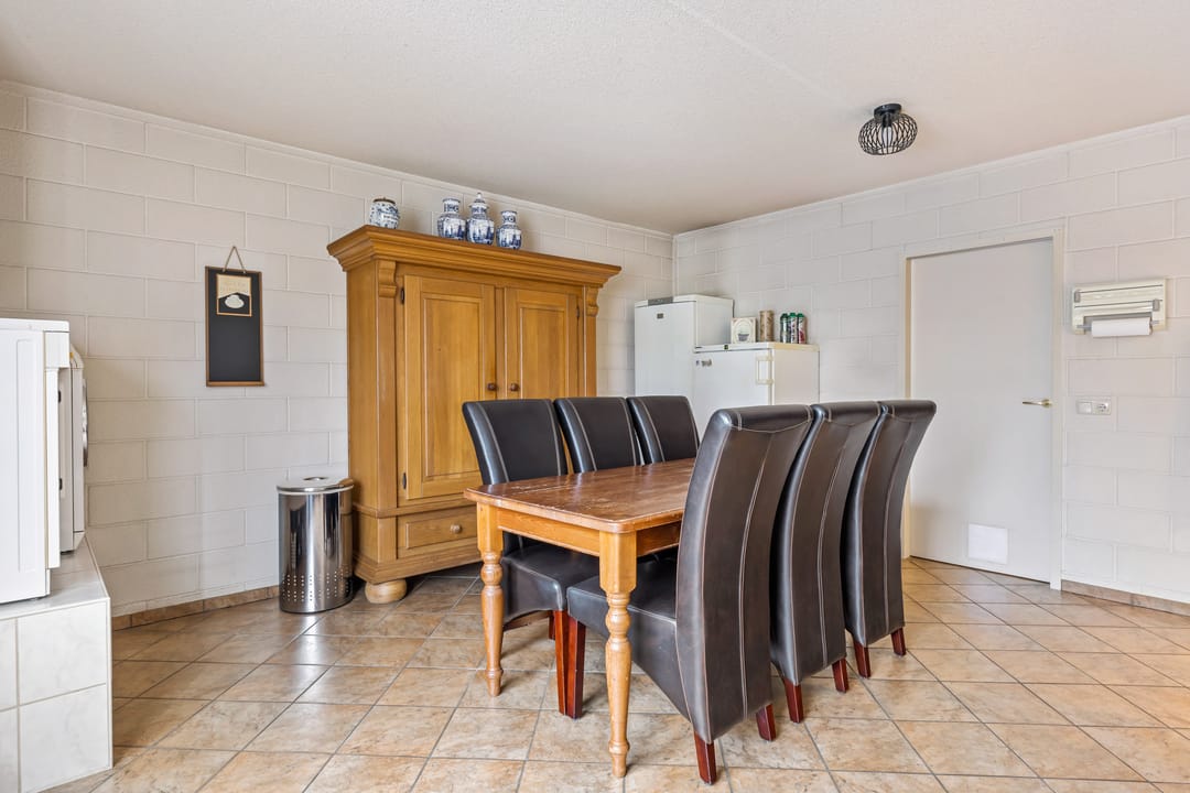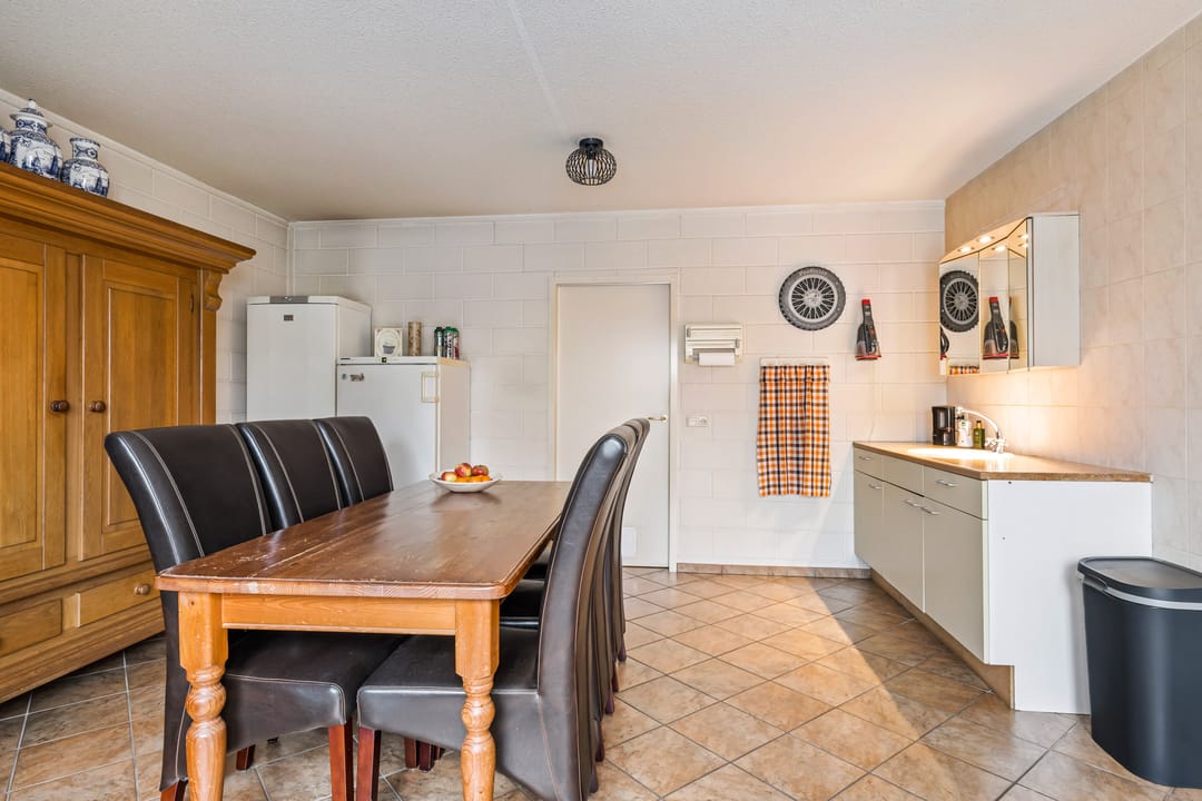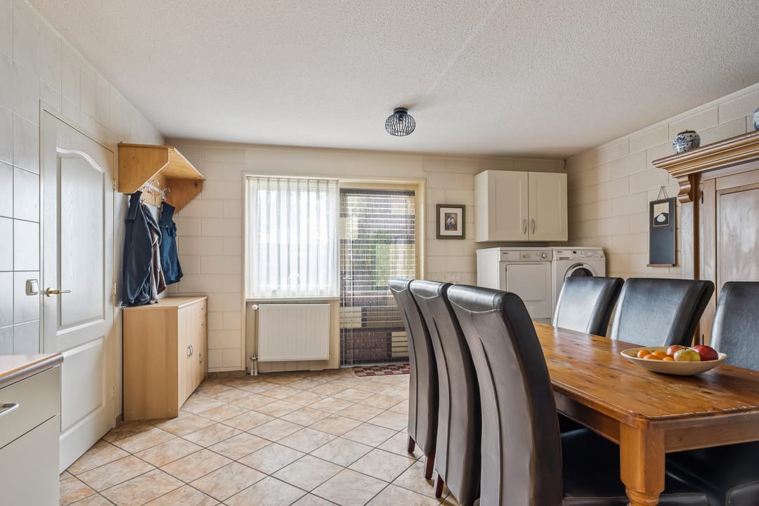 Vanuit de keuken heb je ook toegang tot de bijkeuken. Hier is een extra keukenblok opgesteld met een spoelbak. Daarnaast is er een verhoogde opstelplaats voor het witgoed. Vanuit de bijkeuken heb je toegang tot de tuin en tot de bedrijfshal.