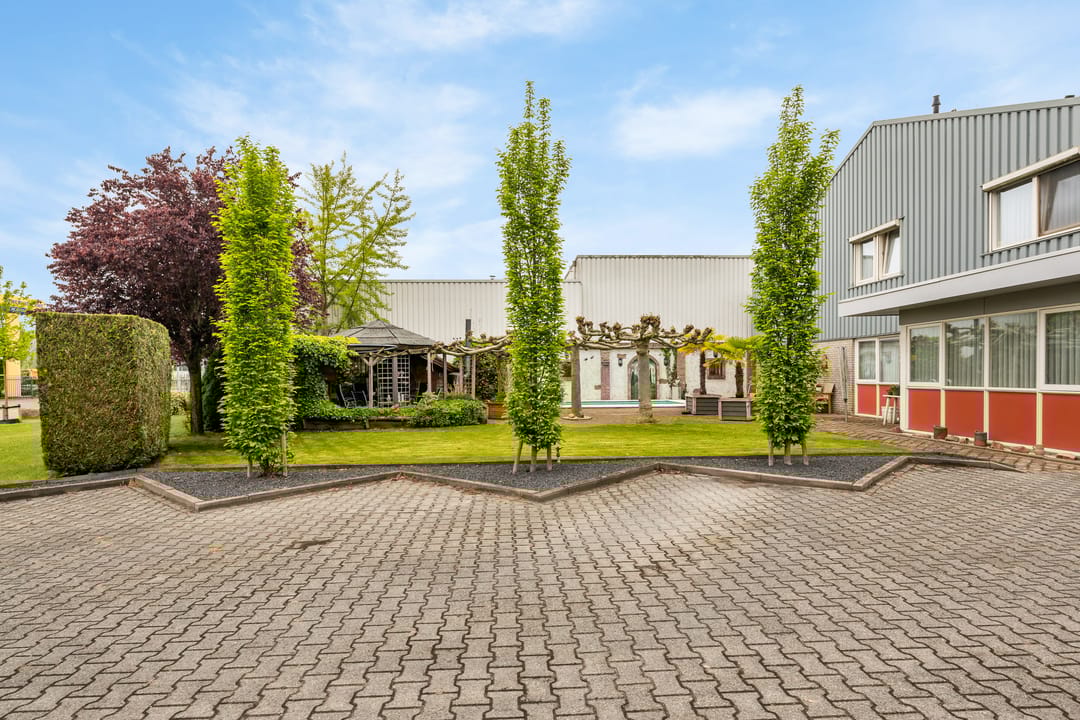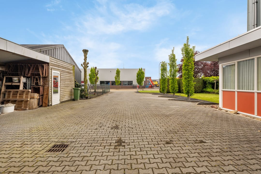 Het buitenterrein en de tuin zijn geheel aan de voorzijde gelegen. Het gedeelte voor de toegang naar de bedrijfshal is geheel verhard en er zijn enkele parkeerhavens gemaakt.