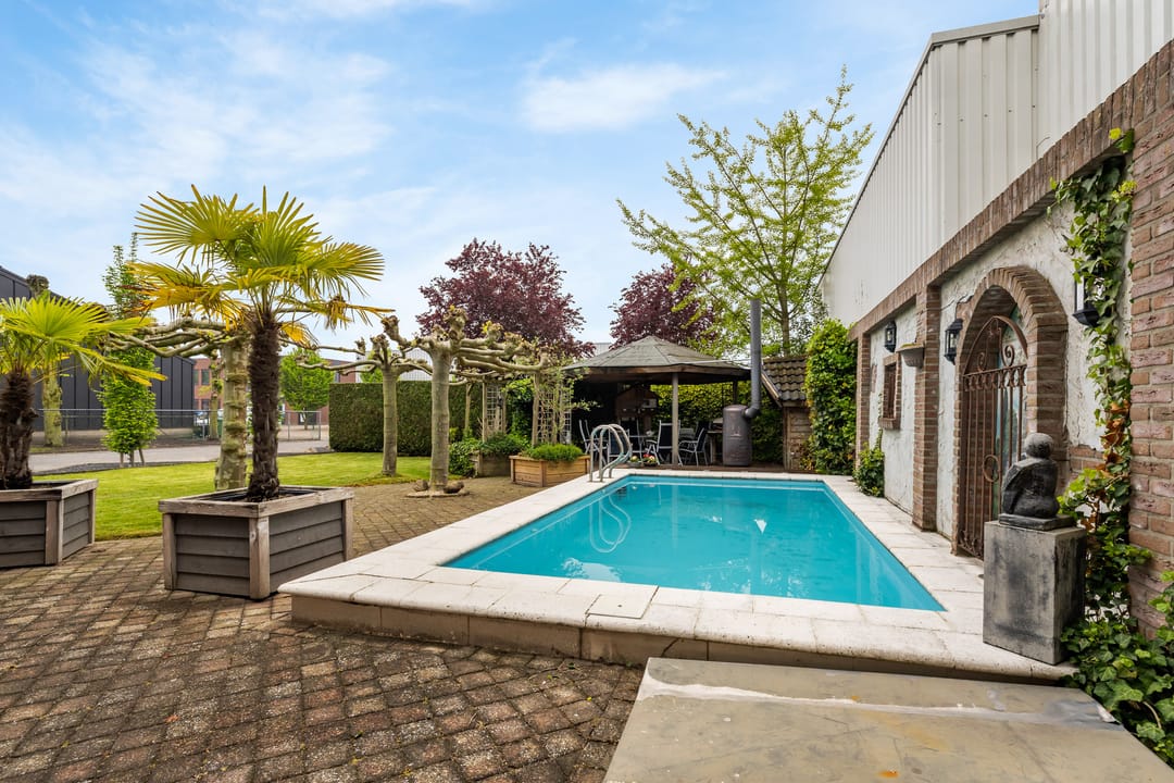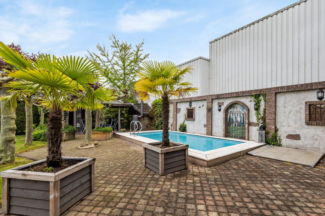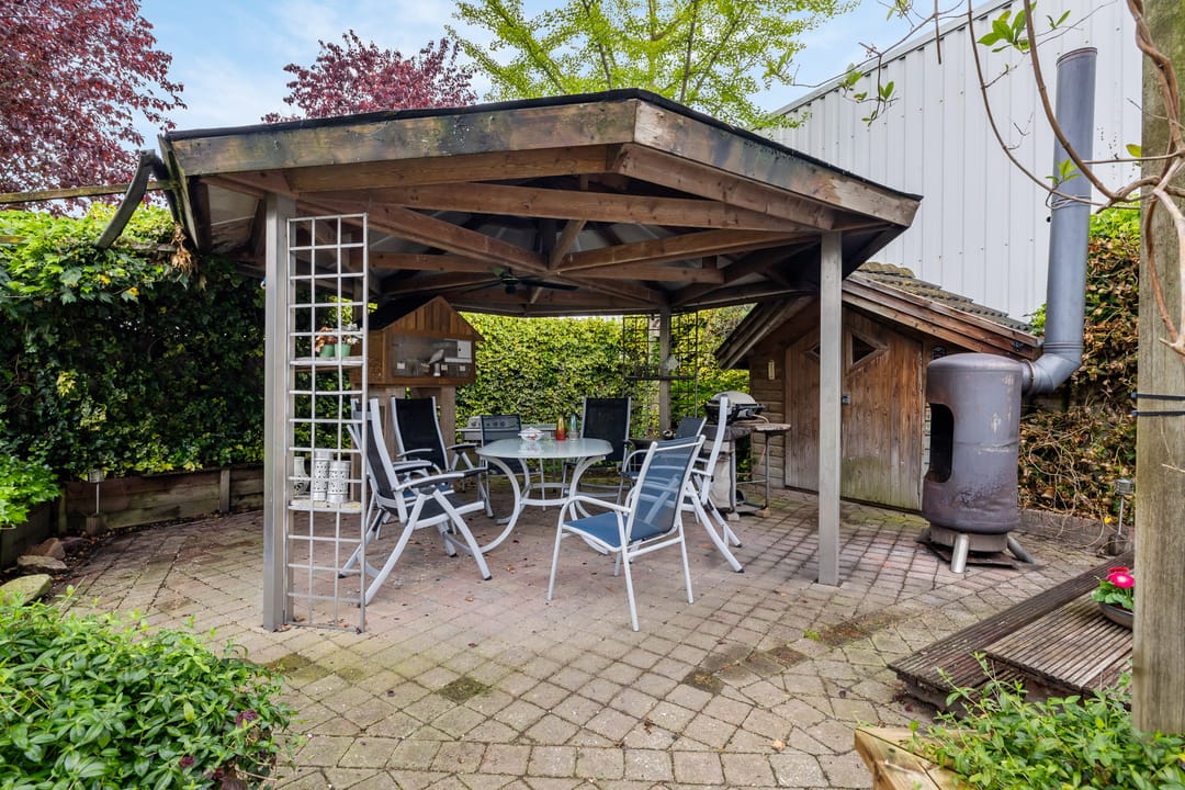 De tuin is aangelegd met gazon en sierbestrating. Daarnaast zijn er enkele fraaie volwassen bomen en struiken. Er is een terrasoverkapping gemaakt en het aangelegde zwembad maakt de tuin helemaal compleet.