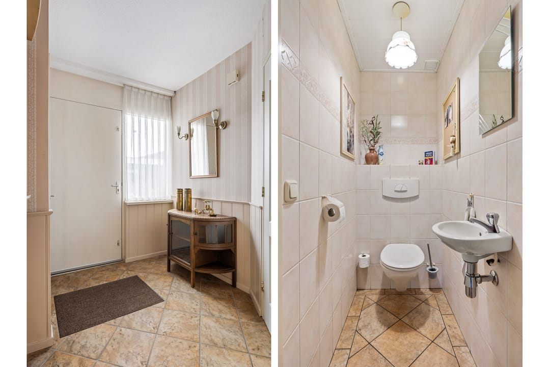 De hal geeft toegang tot de woonkamer. Daarnaast is er de meterkast en de trapopgang naar de 1e verdieping. De hal is afgewerkt met een plavuizen vloer, de wanden zijn afgewerkt met lambrisering en behang en het plafond is gespoten.