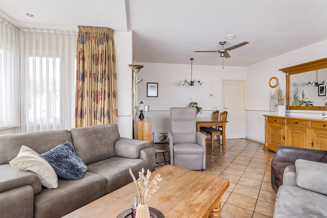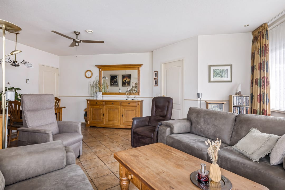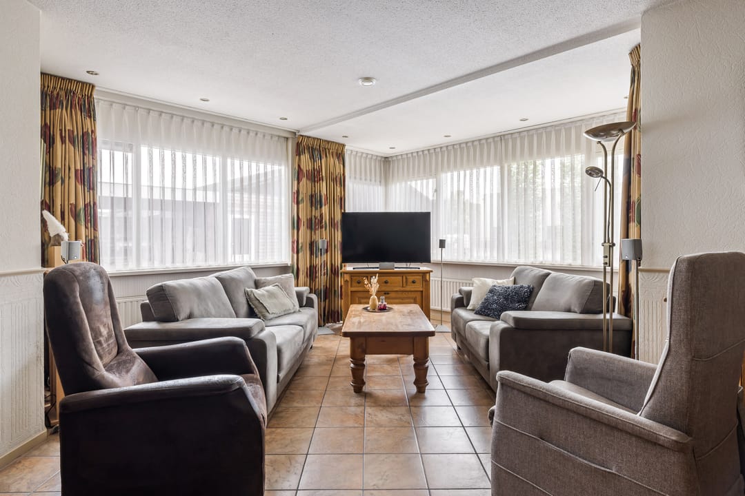 De L-vormige woonkamer heeft veel lichtinval door de ramen in de zuid- en westgevel. Er zijn openslaande tuindeuren naar de tuin en ook hier is de vloer afgewerkt met plavuizen. De wanden zijn afgewerkt met lambrisering en stucwerk en het plafond is gespoten.